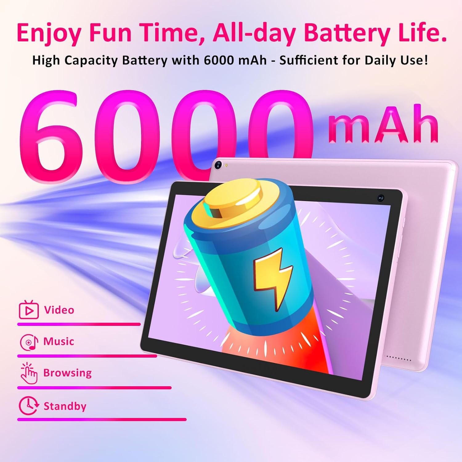 【2+8MP HD Cameras & 6000mAh Big Capacity】 Our tablet adopts high-definition dual cameras, with a front 2MP and a rear 8MP. Photography, video recording, and video conferencing provide you with a smoother and clearer experience. In addition, the tablet is also equipped with a super large 6000mAh battery. Can ensure use for over 6-8 hours. Home entertainment and travel are both good choices, and you can take it anywhere.