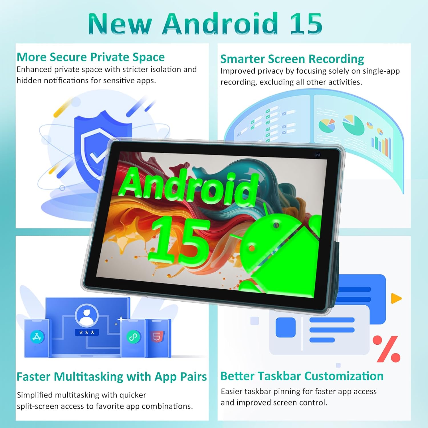 【Android 15 Tablet】 The CP10 Pro ipad tablet is powered by the latest Android 15 OS with AI, ensuring broader app compatibility, faster startup tims, and improved responsiveness. The new system provides a more personalized and safer experience,upgraded privacy protection and security.