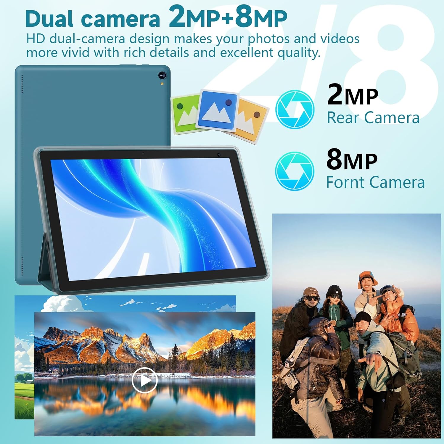 【2+8MP HD Cameras & 6000mAh Big Capacity】 Our tablet adopts high-definition dual cameras, with a front 2MP and a rear 8MP. Photography, video recording, and video conferencing provide you with a smoother and clearer experience. In addition, the tablet is also equipped with a super large 6000mAh battery. Can ensure use for over 6-8 hours. Home entertainment and travel are both good choices, and you can take it anywhere.