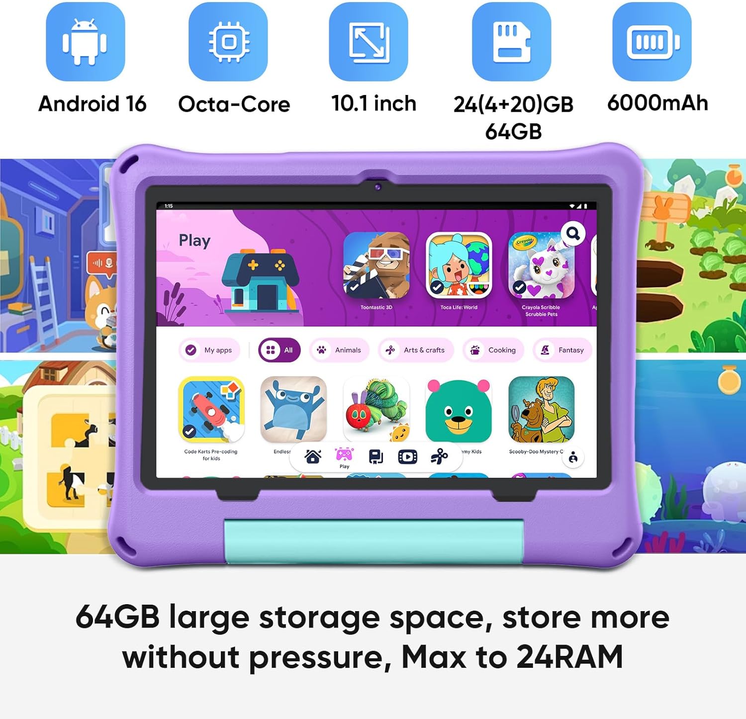 10 inch Kids Tablet, Android 16 Tablet for Kid, Octa-Core Processor, 24GB RAM, 64GB ROM 1TF Card Expandable for Toddler Children,Tablets with Case, Parental Control, 6000mAh,WiFi, BT5.0 (Purple)