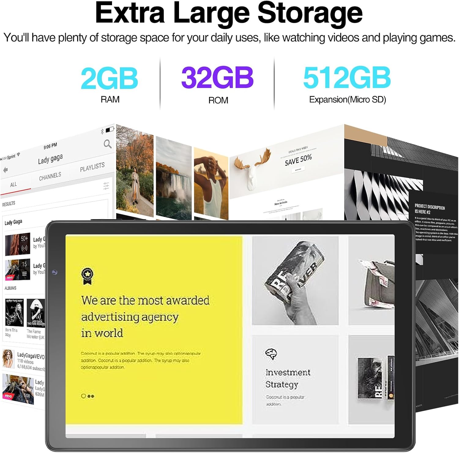 2GB RAM + 32GB ROMThis Android tablet comes bundled with 32GB ROM, and up to 512GB of external memory with micro SD card support(Not included ).
