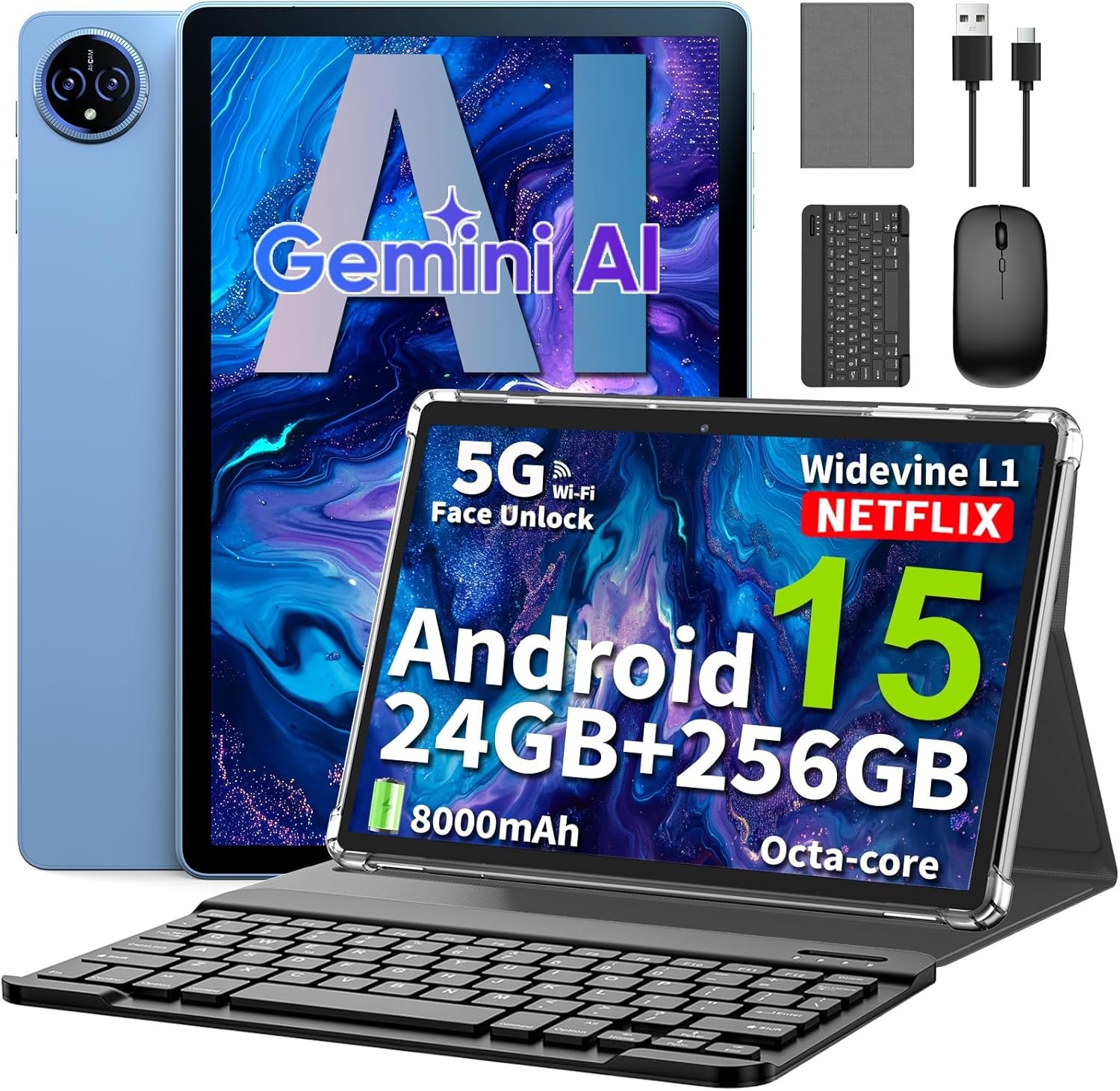 11 inch Tablet, Android 15 Tablet with Keyboard, 24GB RAM, 256GB ROM, 2TB Expand, Octa-core, 8000mAh, 2.4G&5G WiFi, GMS, Gemini AI, 2 in 1 Tablets with Case, Mouse, Stylus (Silver Case)