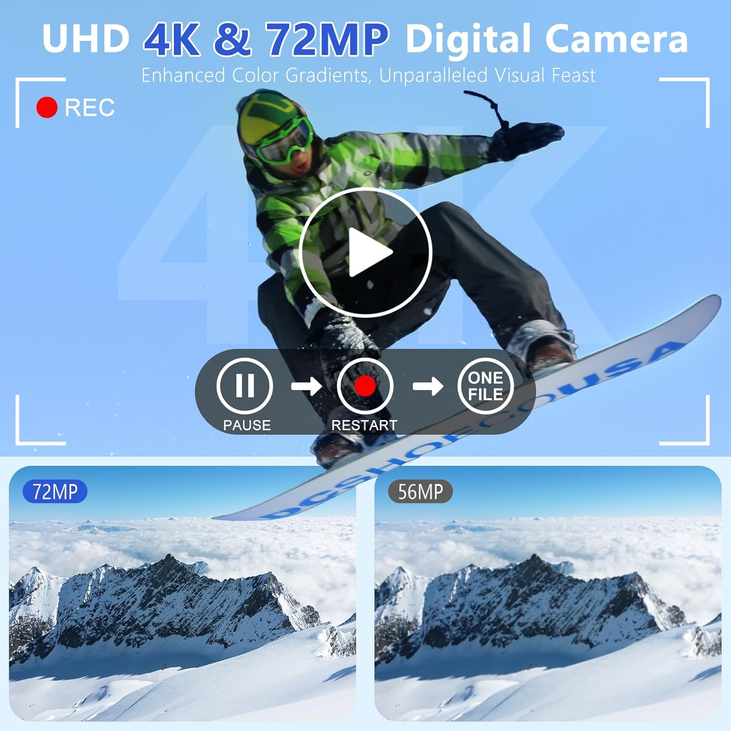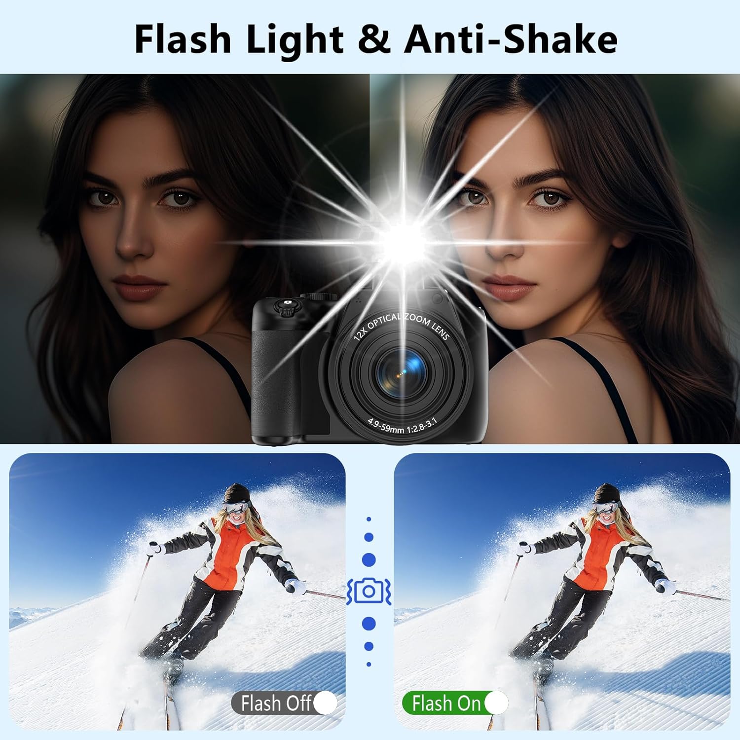 𝟏𝟐𝐗 𝐎𝐩𝐭𝐢𝐜𝐚𝐥 𝐙𝐨𝐨𝐦 & 𝐁𝐮𝐢𝐥𝐭-𝐢𝐧 𝐅𝐥𝐚𝐬𝐡: 72MP 12x Optical Zoom Digital Camera Captures Distant Scenery Details Without Losing Quality. The Digital Camera Built-in Flash Ensure Clear Low-Light Shots. With Fast Autofocus and Built-in Anti-shake, Every Shot Remains Sharp and Clear. This Professional Digital Camera is ideal for Beginner Photographers —ideal for Travel, Portraits, and Landscape Shots. Documenting Everyday Moments or Travel Experiences