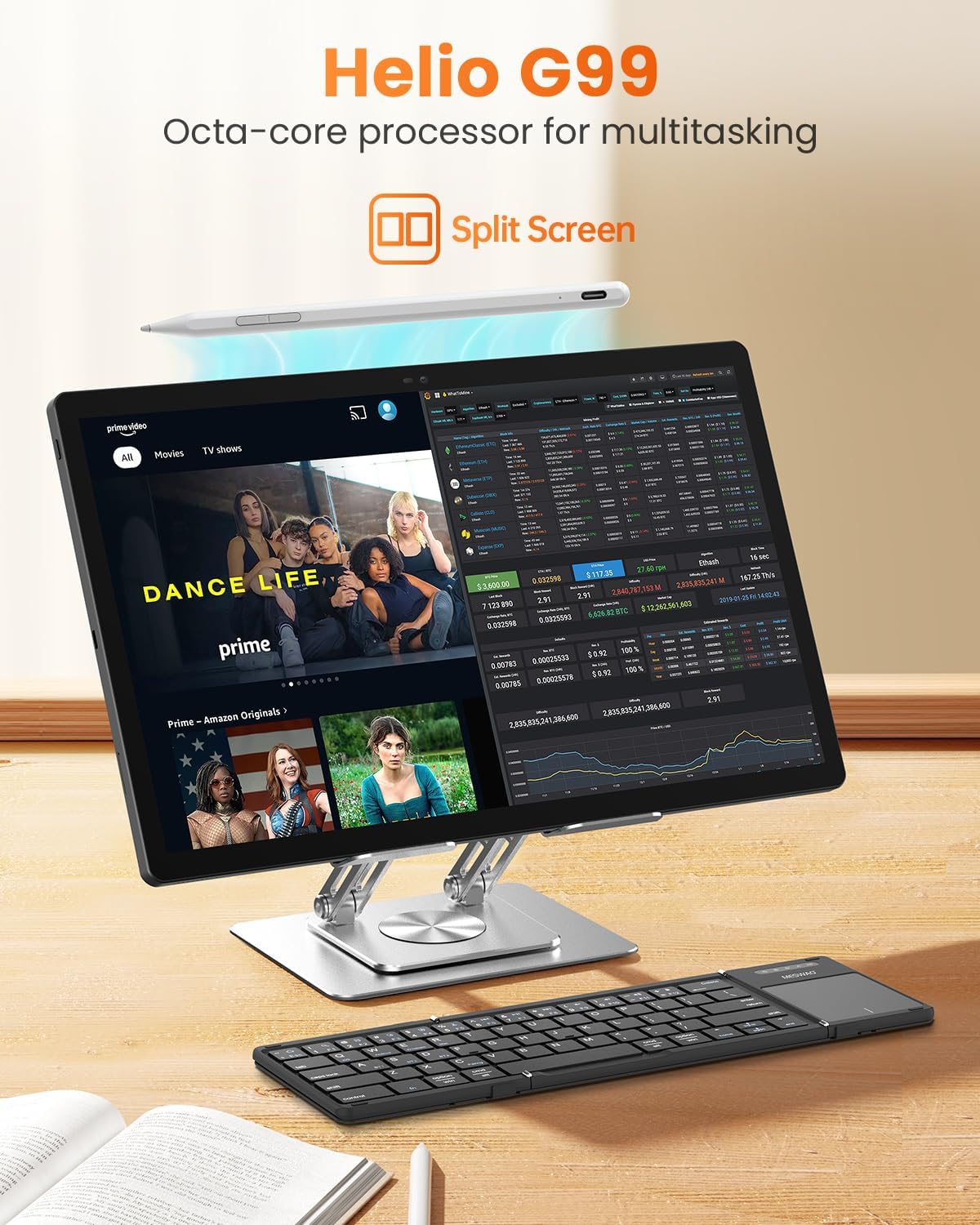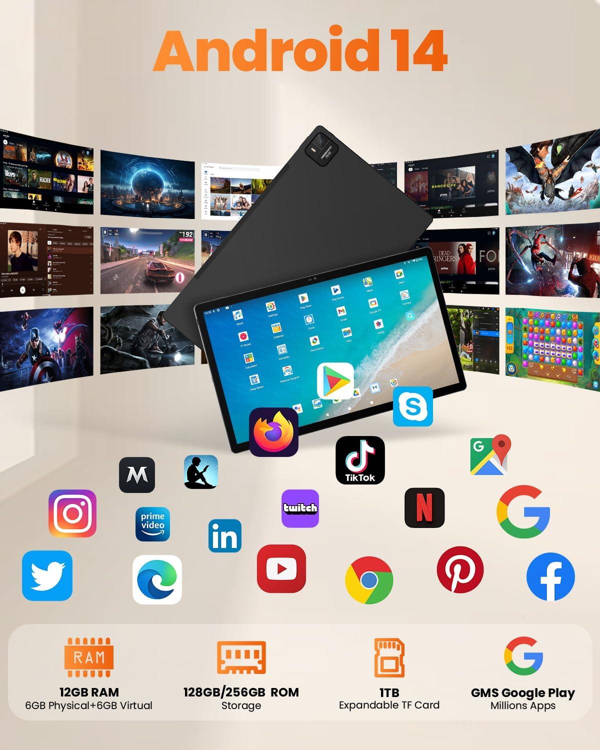 HIGH PERFORMANCE PROCESSING POWER: Powered by a Helio G99 Octa – Core CPU processor and paired with 6+6GB of RAM, this tablet offers seamless multitasking. Switch between multiple apps effortlessly, whether it’s running APP, editing documents, or having multiple browser tabs open. With 256GB of internal storage expandable up to 1TB via a micro SD card, you’ll never run out of space for your apps, photos, and videos