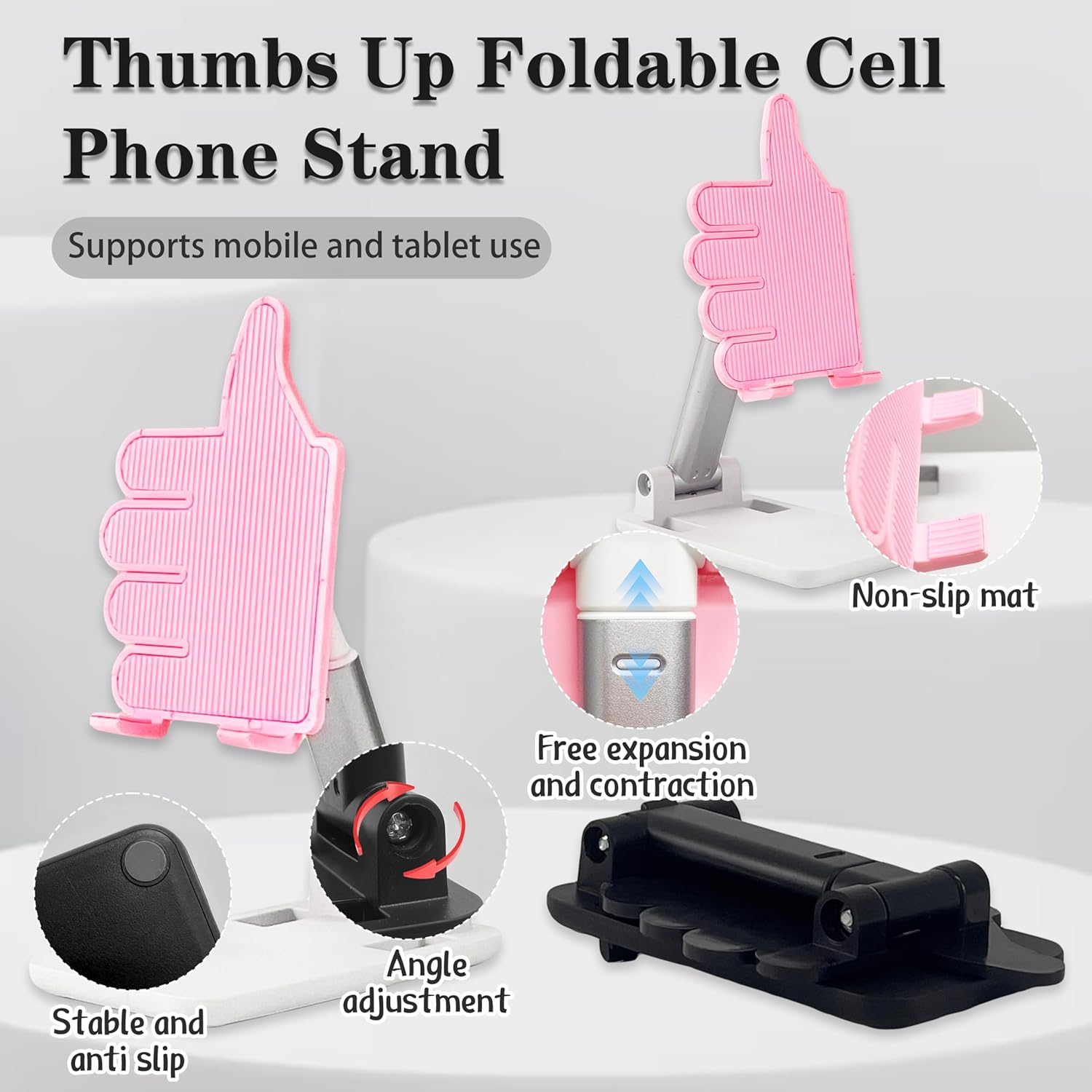 2 Pack Black&Pink Thumbs Up Foldable Cell Phone Stand Holder for Desk, Adjustable Silicone Anti-Slip Compatible with All Mobile Phones, Cool Gadgets Fun Desktop Accessory Valentines Day