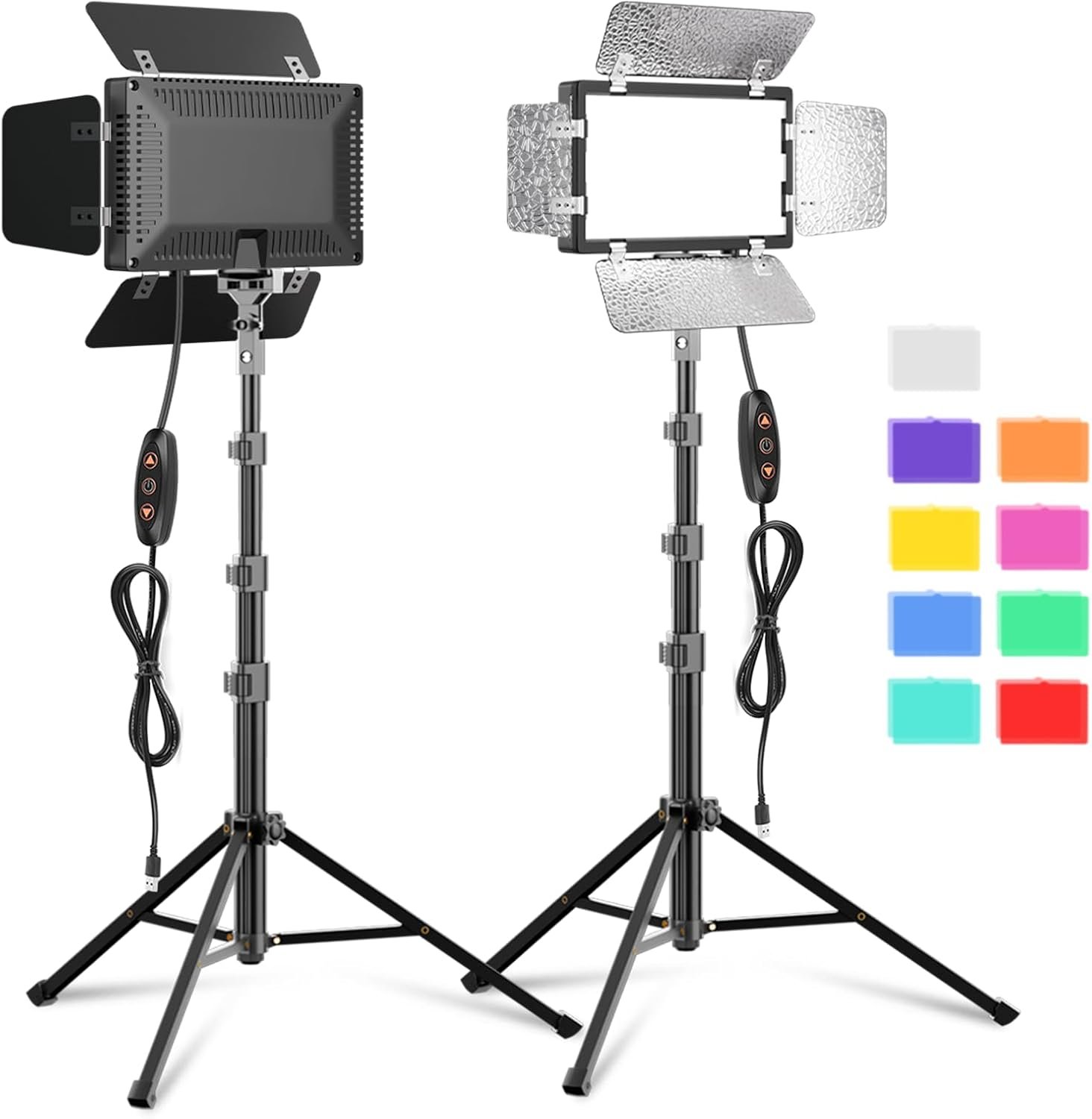 2 Pack LED Video Photography Lighting Kit with 54” Tripod Stand, Dimmable 5600K USB Studio Lights with Barndoor -9 Color Lighting for Video Recording, Photo Studios, YouTube, TikTok, Game Streaming