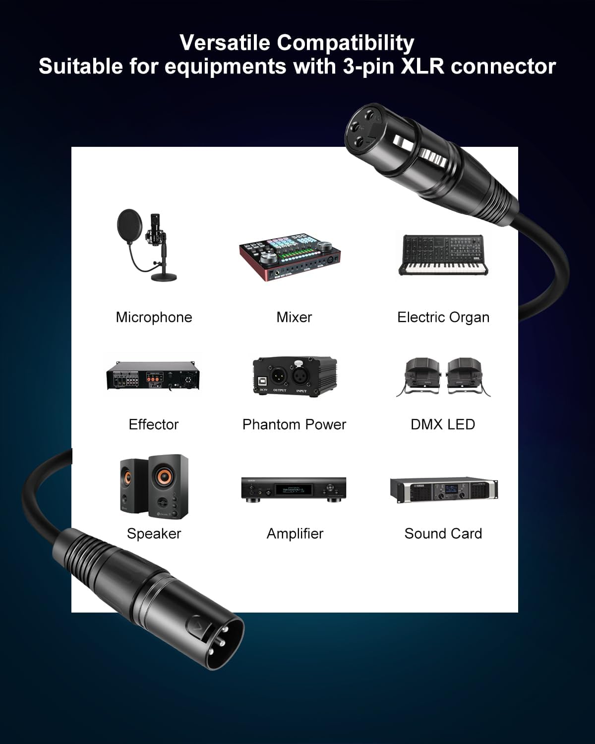 【Wide Compatibility】 Built with a high-quality XLR male-to-female connector, our male-to-female XLR cable is compatible with equipment with 3-pin XLR connectors, such as microphones, studio harmonizers, mixing boards, patch bays, preamps, speaker systems, stage lighting, etc. Widely used at stage sound, KTV, professional sound reinforcement, home theater, and other environment