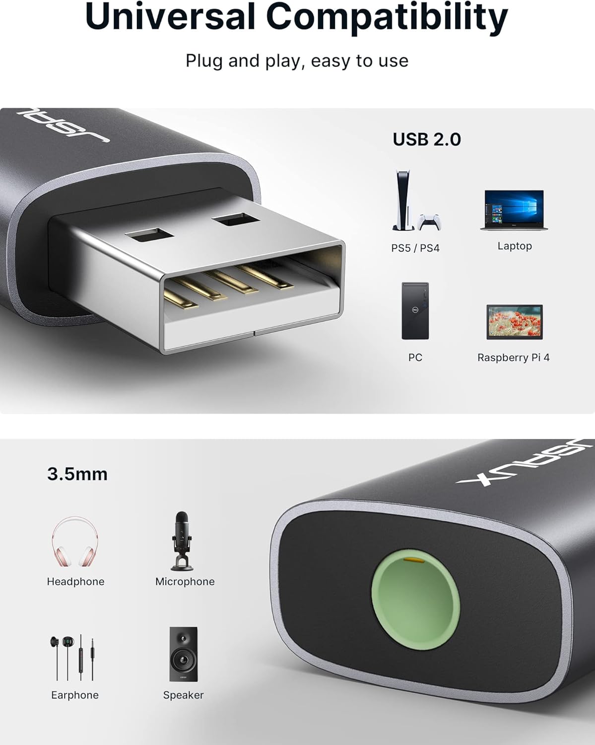 【USB to 3.5mm jack audio adapter】 Ideal to connect a CTIA 3.5mm headset, TRRS mic or speaker to PC via USB interface. Support stereo sound listening + speaking, dual functions. Easily add a 3.5mm TRRS aux port for your devices, or a replacement for a failed USB sound card audio adapter. (Unidirectional audio transmission: For listening functions, this USB port is output, not input. Audio can only transfer from USB port to 3.5mm port)