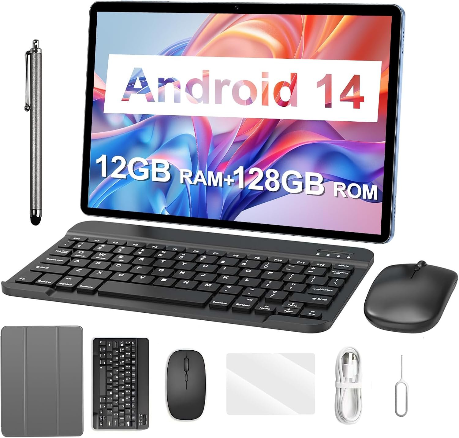 2025 Android 14 Tablet 10 Inch, 12GB RAM+128GB ROM 1TB Expandable, 2-in-1 Tablet with Keyboard Case, Mouse & Stylus, Octa-Core, WiFi, 6000mAh Battery, 1280×800 IPS HD Screen(Black)