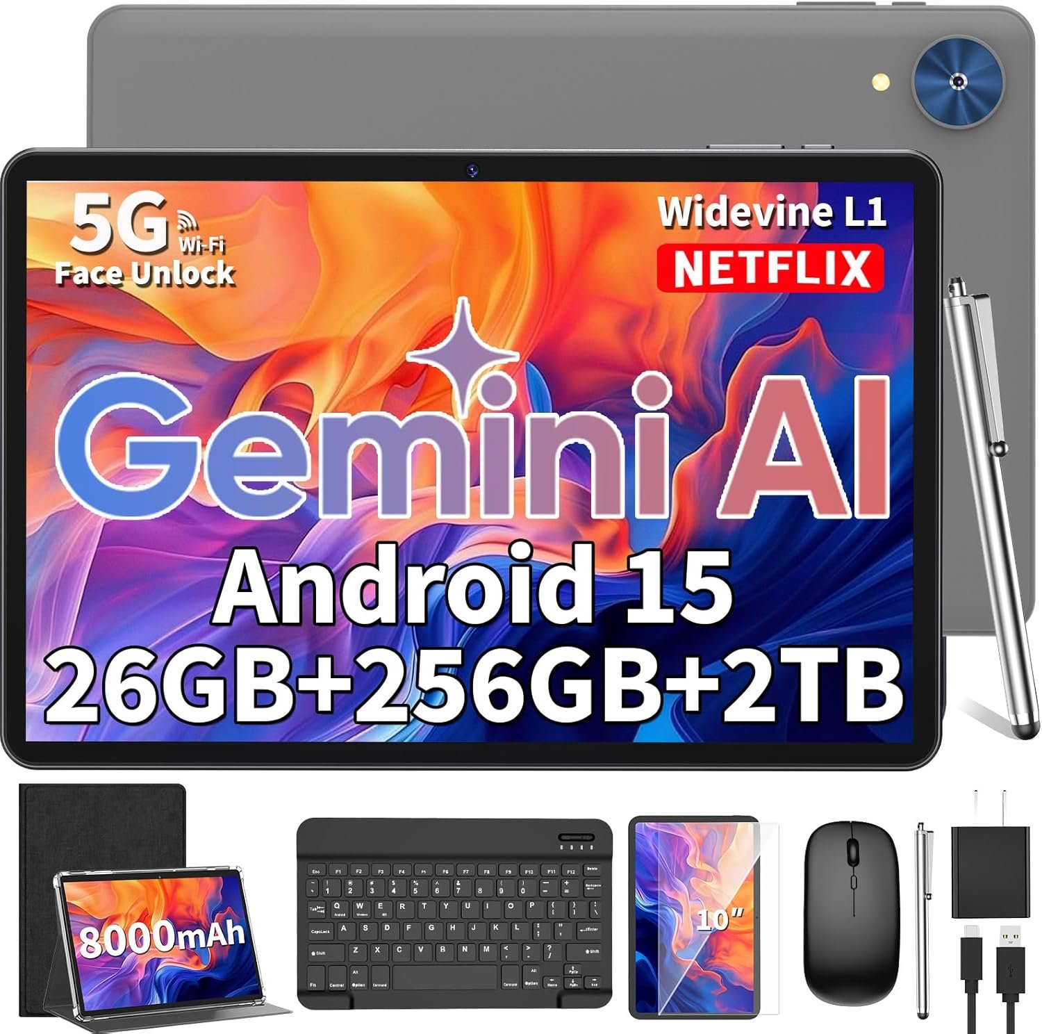 2026 Android 15 Tablet, 10 inch Tablet with Keyboard, 24GB+256GB+2TB Expand, 2-in-1 Tablets with 8-Core, 5G WiFi, 8000mAh, BT5.0, GMS, GPS, Gemini AI, Tablets PC with Mouse, Case, Stylus (Black)