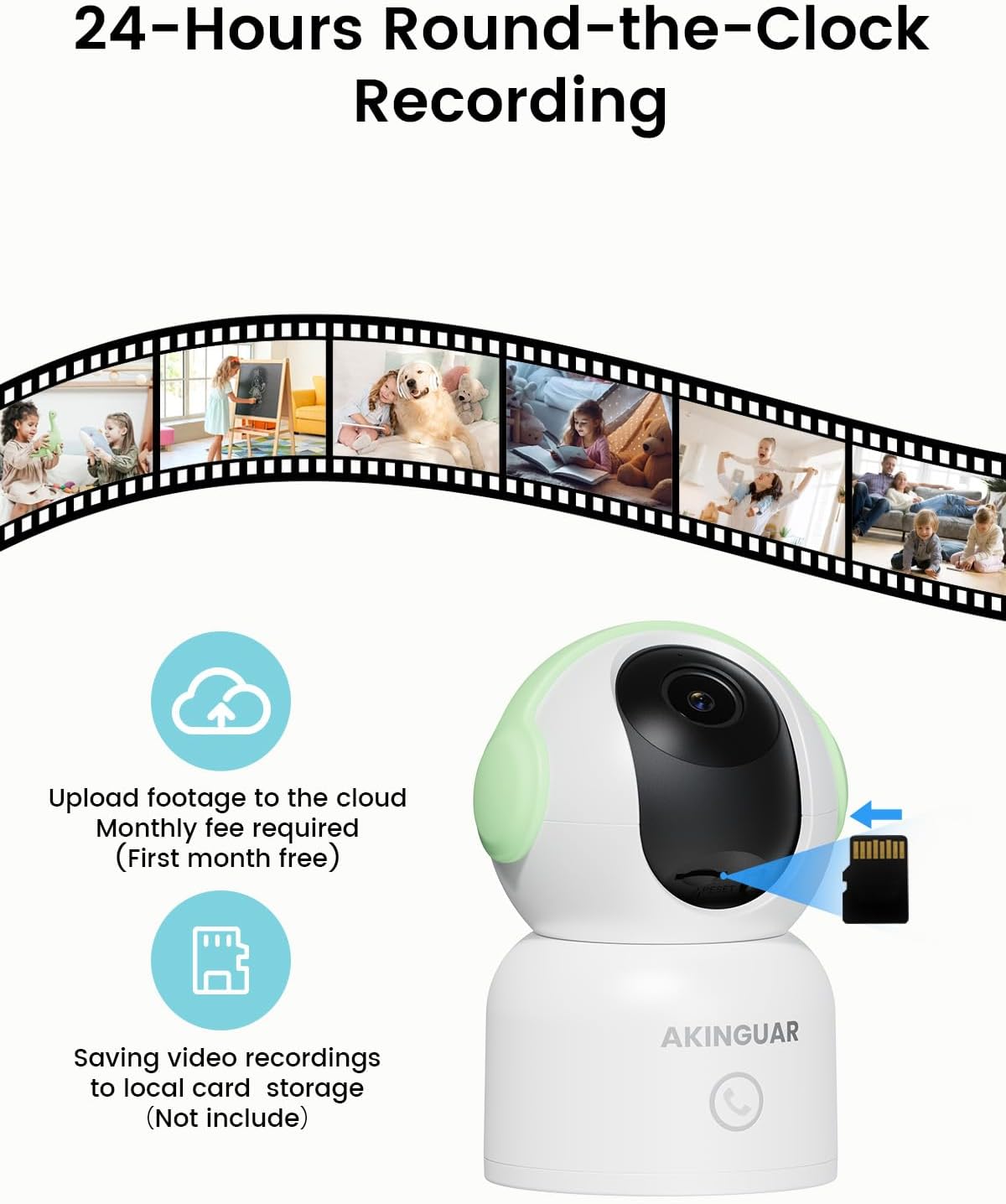 【Privacy Zone & Flexible Storage】You can customize the area to protect your privacy. The AKINGUAR indoor WiFi camera supports continuous recording. Insert a Memory Card (up to 256GB, not included) for storage, or try cloud storage (with a free trial of up to 30 days) to prevent loss of videos and photos.