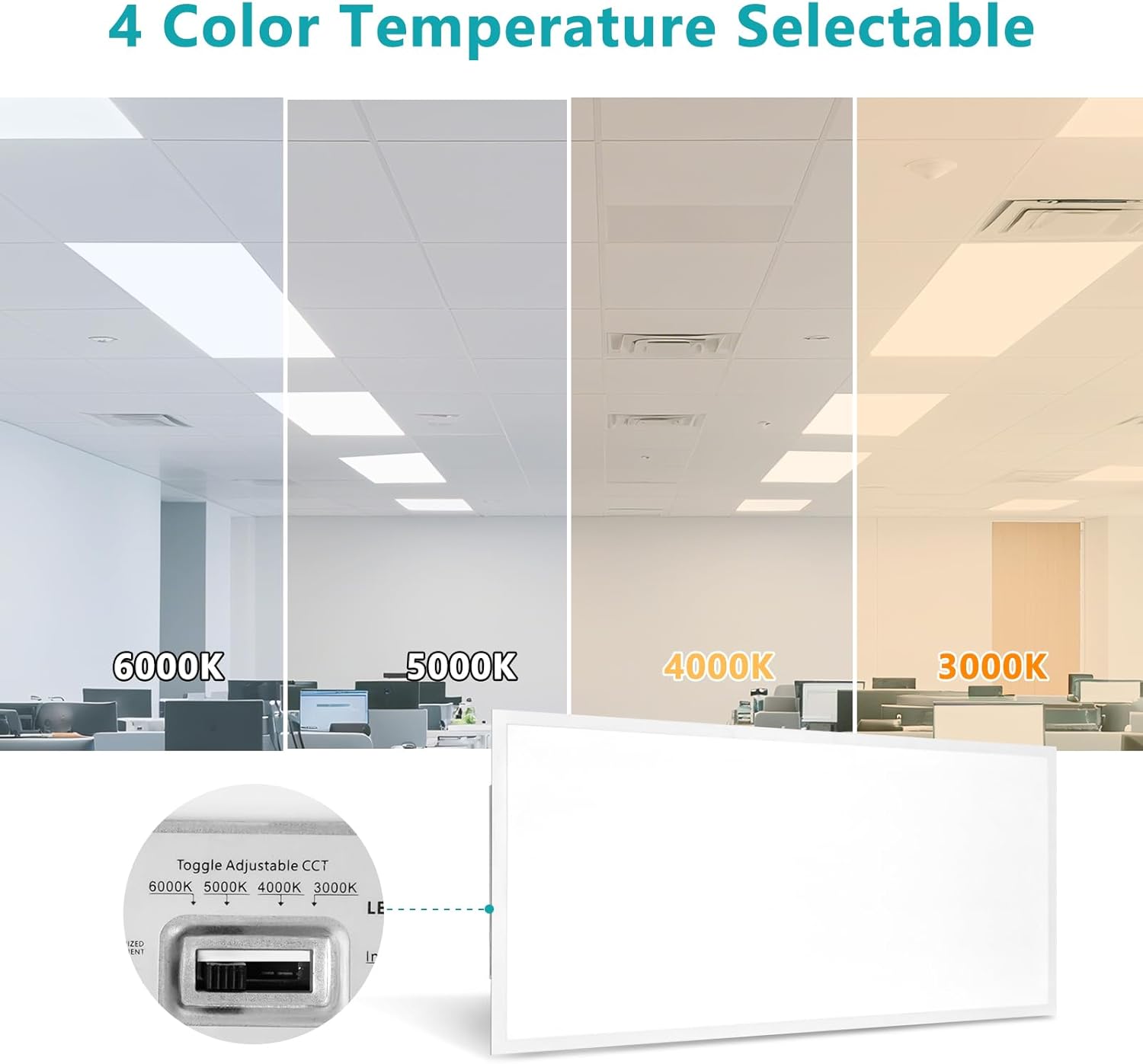 The VocgoUU 2×4 led flat panel light features 4 built-in color temperatures: 3000K (warm white), 4000K (neutral), 5000K (daylight), and 6000K (cool white). You can easily switch between them to suit your space.