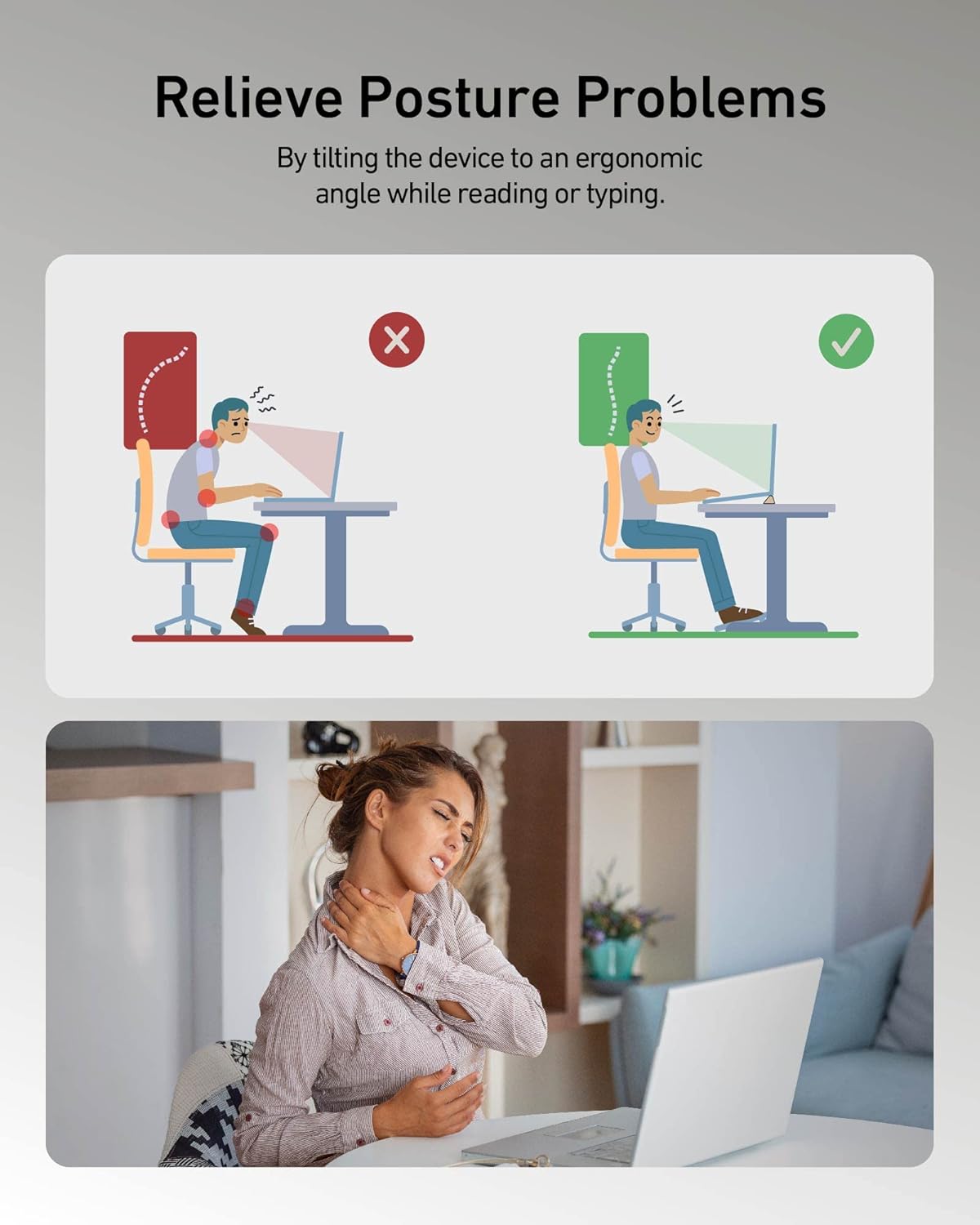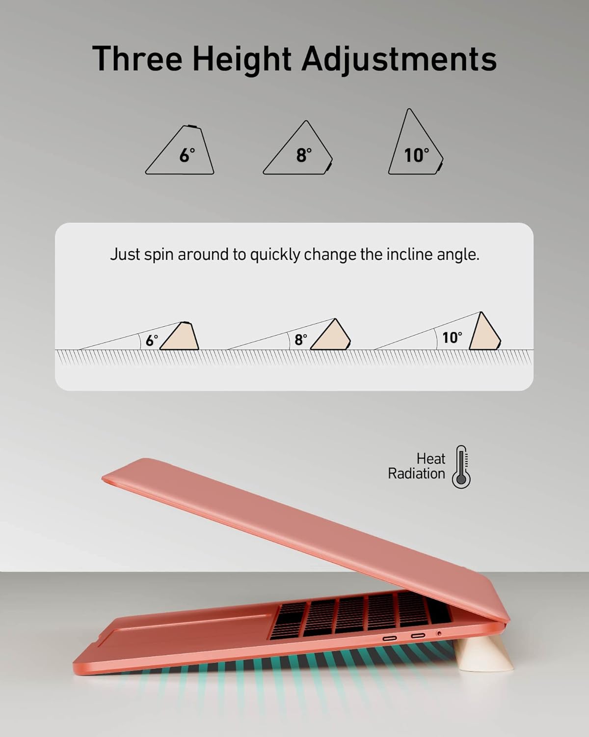 【Three Ergonomic Angles】 Available in incline levels 6°, 8°, and 10°, which are rational heights for reading and typing, this laptop cooling stand can alleviate posture-related problems such as muscle, wrist, and repetitive strain injury.