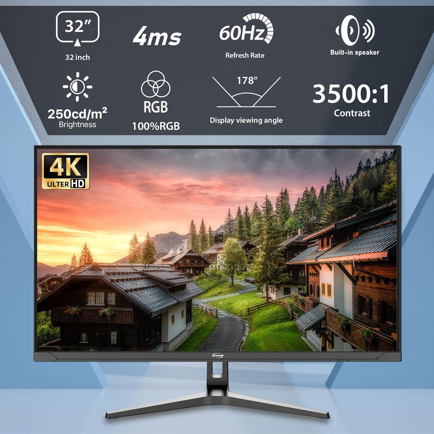 32 Inch 4K Computer Monitor, 60Hz UHD Gaming Monitor, VA Panel, HDR, DCI-P3 86%, 100% sRGB, Eye Care, Freesync, HDMI/DP and Built-In Speaker, VESA 75*75mm