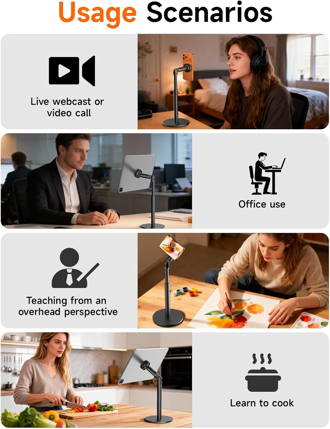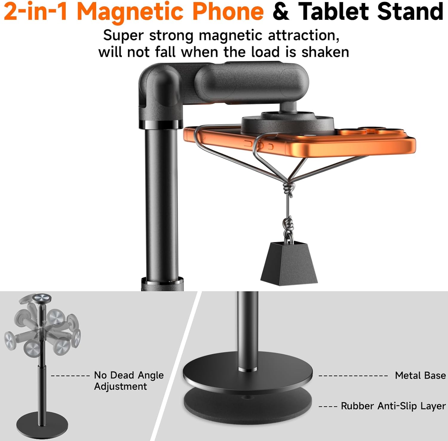 【Multi-Functional Desk Tripod】This rotating magnetic phone holder effortlessly handle various daily scenarios—desk conference, video recording, live streaming, cooking, etc. Adjust its height and angle to the optimal position, make your life much easier