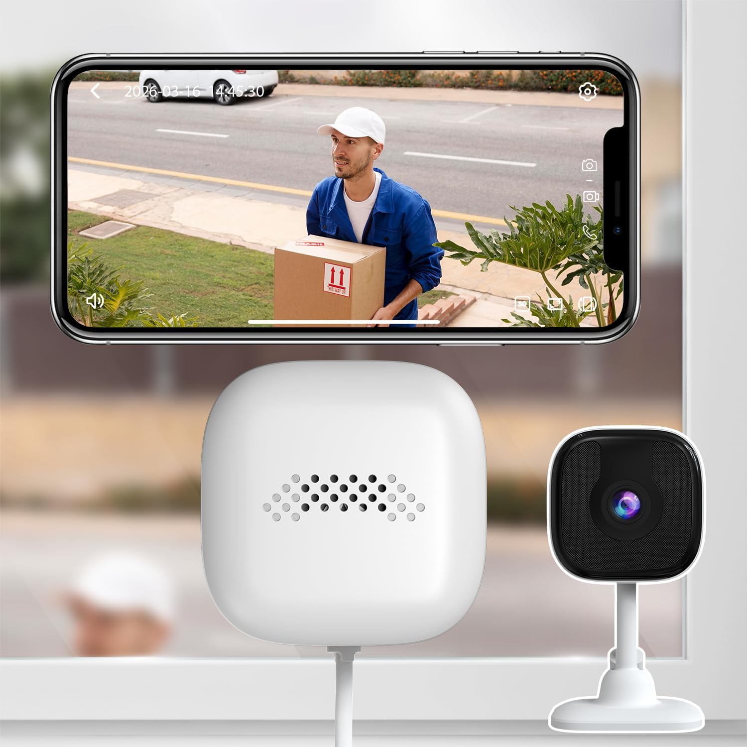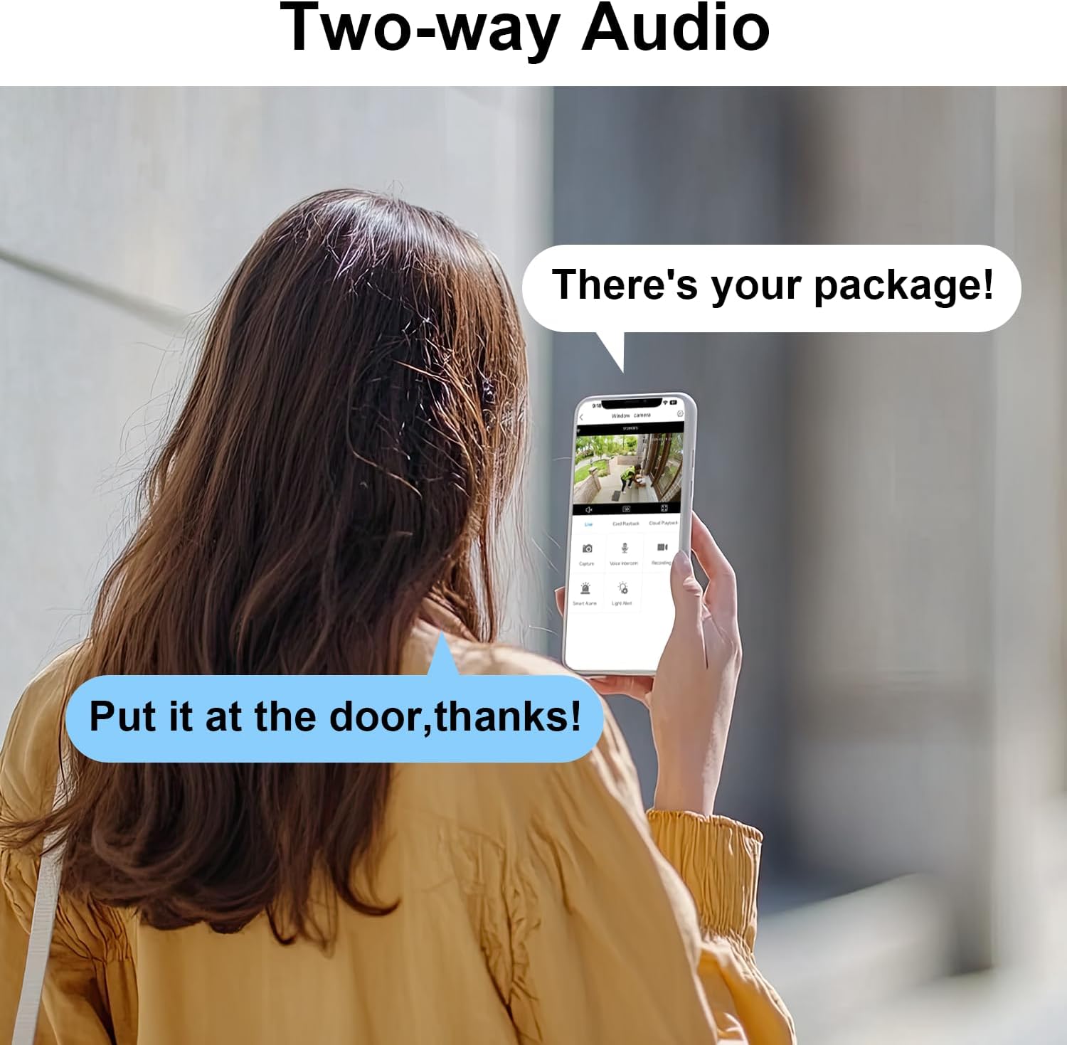 【2-Way Audio】The built-in microphone and speaker allow you to hear and speak directly through the app from anywhere, whether to greet a visitor or deter an intruder.