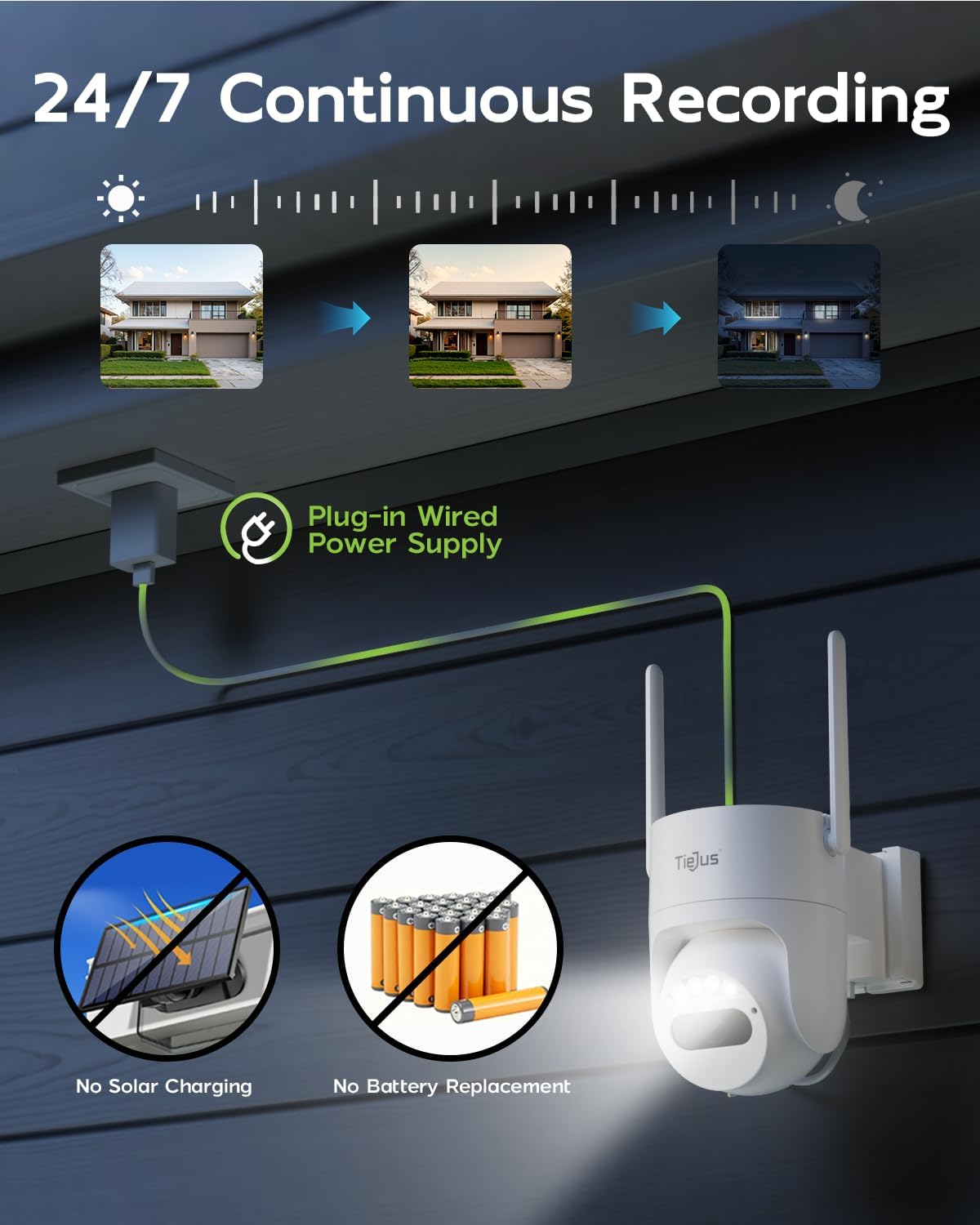 This camera model is designed for direct plug-in power to ensure consistent and reliable operation, independent of sunlight. This makes it ideal for locations with readily available power outlets.