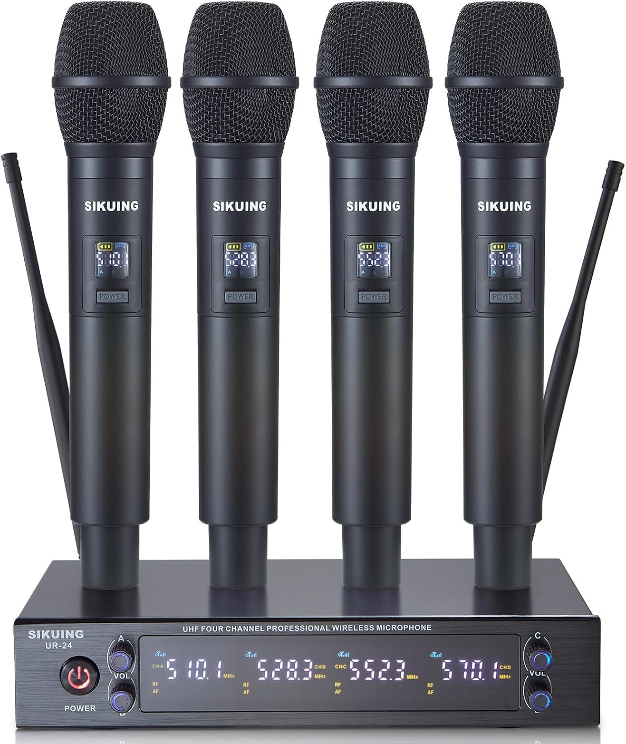 4 Channel UHF Wireless Microphone System with Cordless Handheld Mics, 4×50 Adjustable Frequencies, Ideal for Karaoke Meeting Church, 300ft Range (4 Handheld)