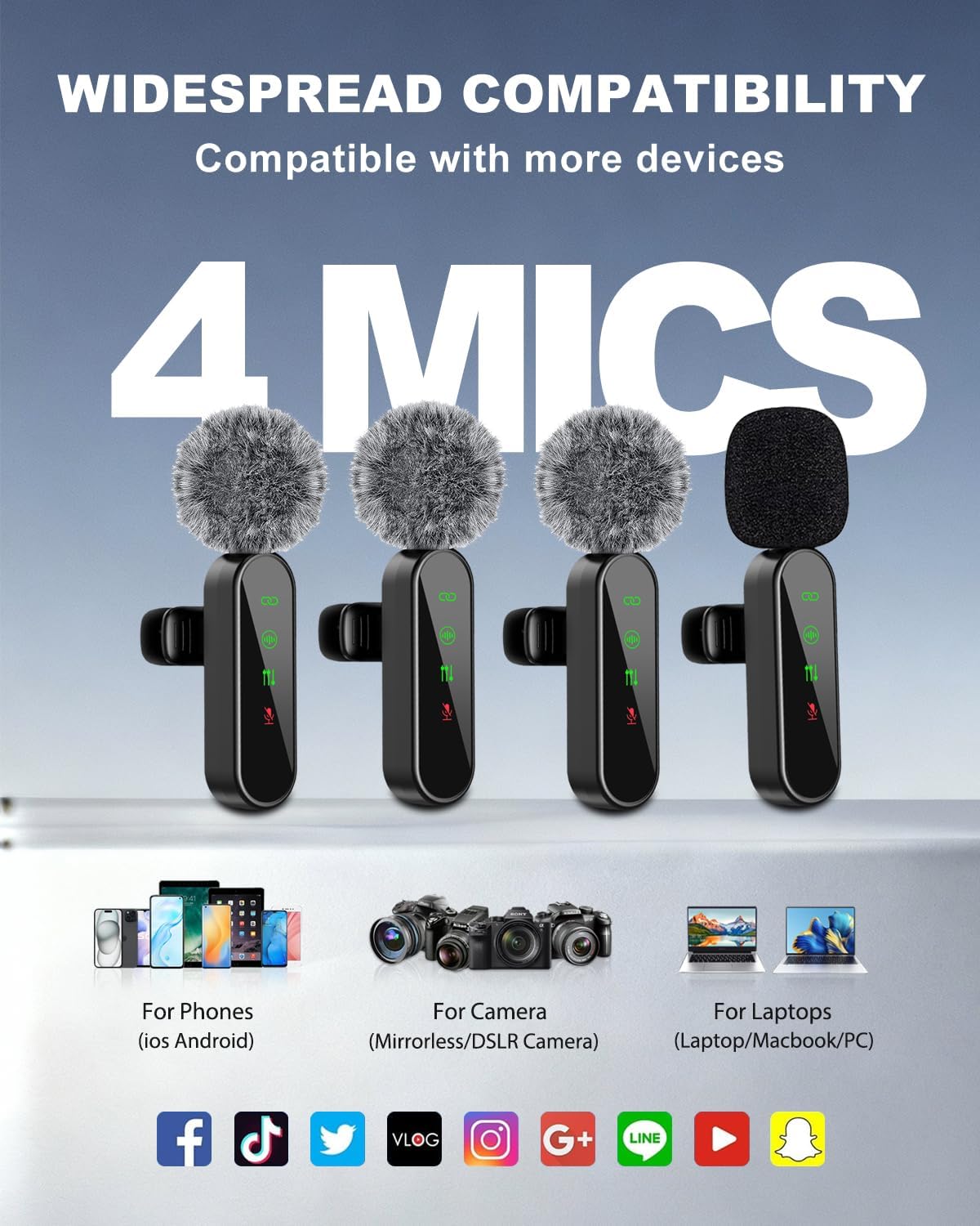 4 Packs Wireless Lavalier Microphone for iPhone/Android/Camera, Upgraded Mini Microphone with Noise Reduction, Mic for Video Recording, Podcasts, YouTube, TikTok, and Vlogging