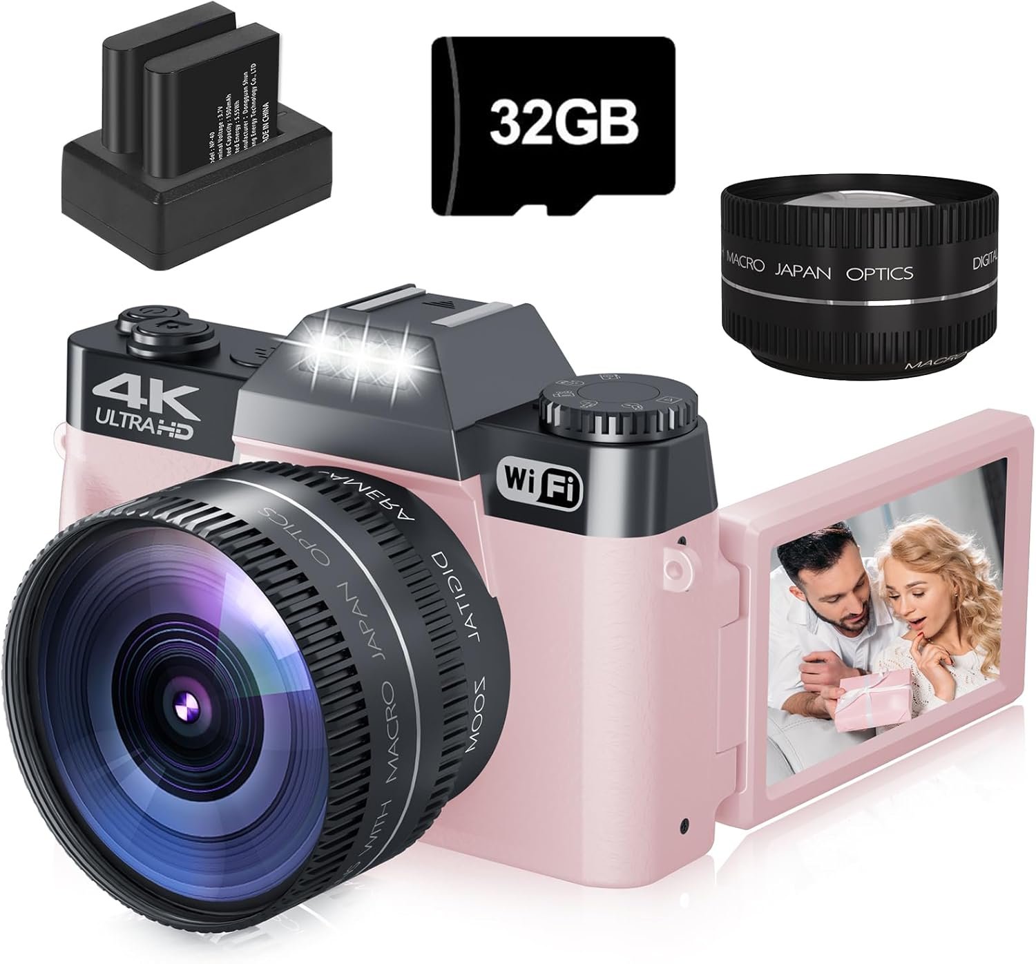 【Complete Camera Kit】 Package includes: 4K Digital Camera ×1, USB Data Cable ×1, Rechargeable Batteries ×2, Battery Charger ×1, Lens Cap ×1, 32GB Memory Card ×1, User Manual ×1, Macro Lens ×1, and Wide Angle Lens ×1. A full set of accessories so you can start shooting right out of the box.