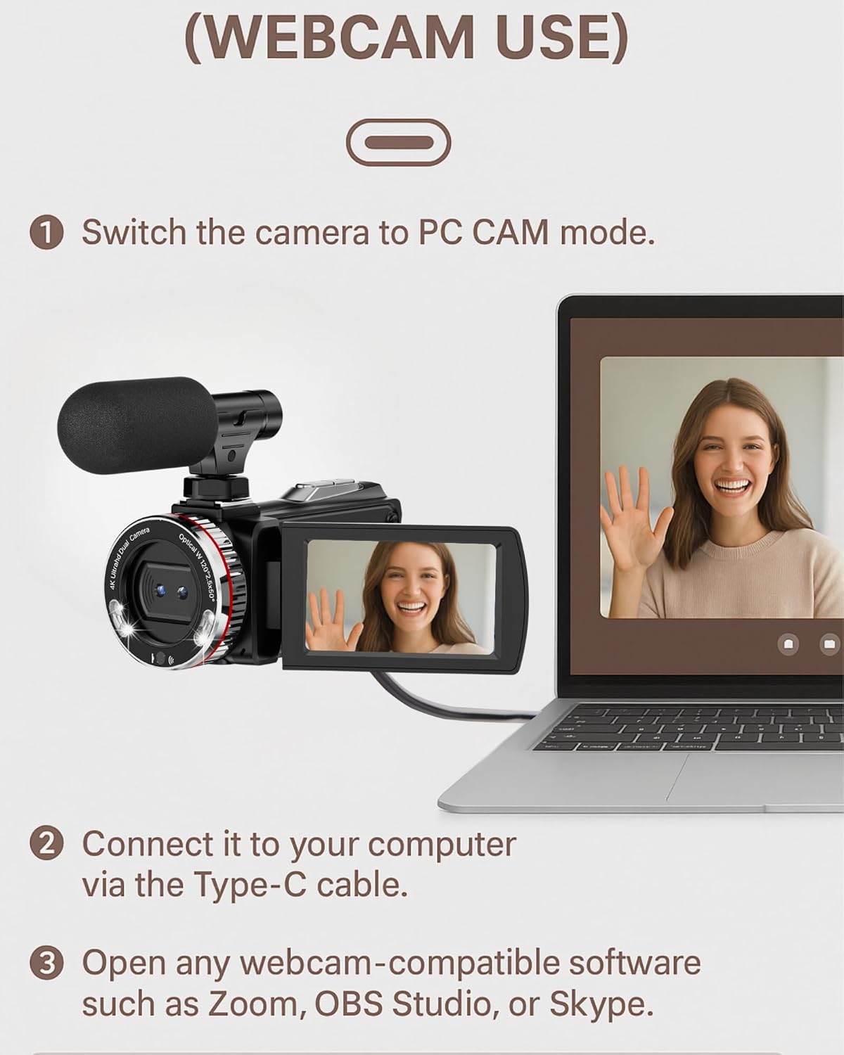 𝐖𝐞𝐛𝐜𝐚𝐦 & 𝐇𝐃𝐌𝐈 𝐎𝐮𝐭𝐩𝐮𝐭: Transform your camcorder into a webcam by connecting it to your computer via USB and selecting “PC Camera” mode. Easily live stream on Facebook, YouTube, or Instagram. Additionally, enjoy your HD videos on a TV by connecting the camcorder with an HDMI cable for an immersive viewing experience.