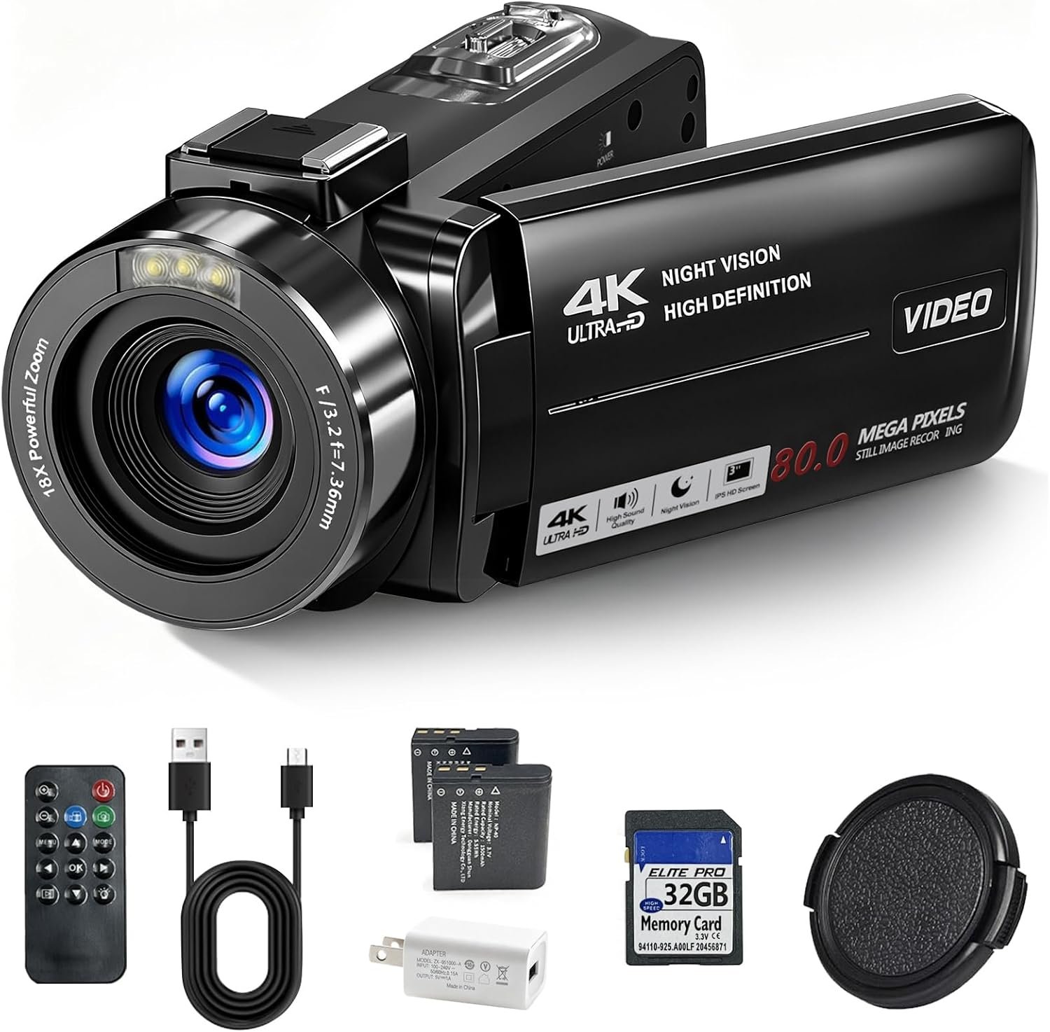 4K Camcorder Video Camera, 80MP HD Vlogging Camera for YouTube with IR Night Vision, 18X Digital Zoom, 3.0″ IPS Screen, SD Card, 2 Batteries