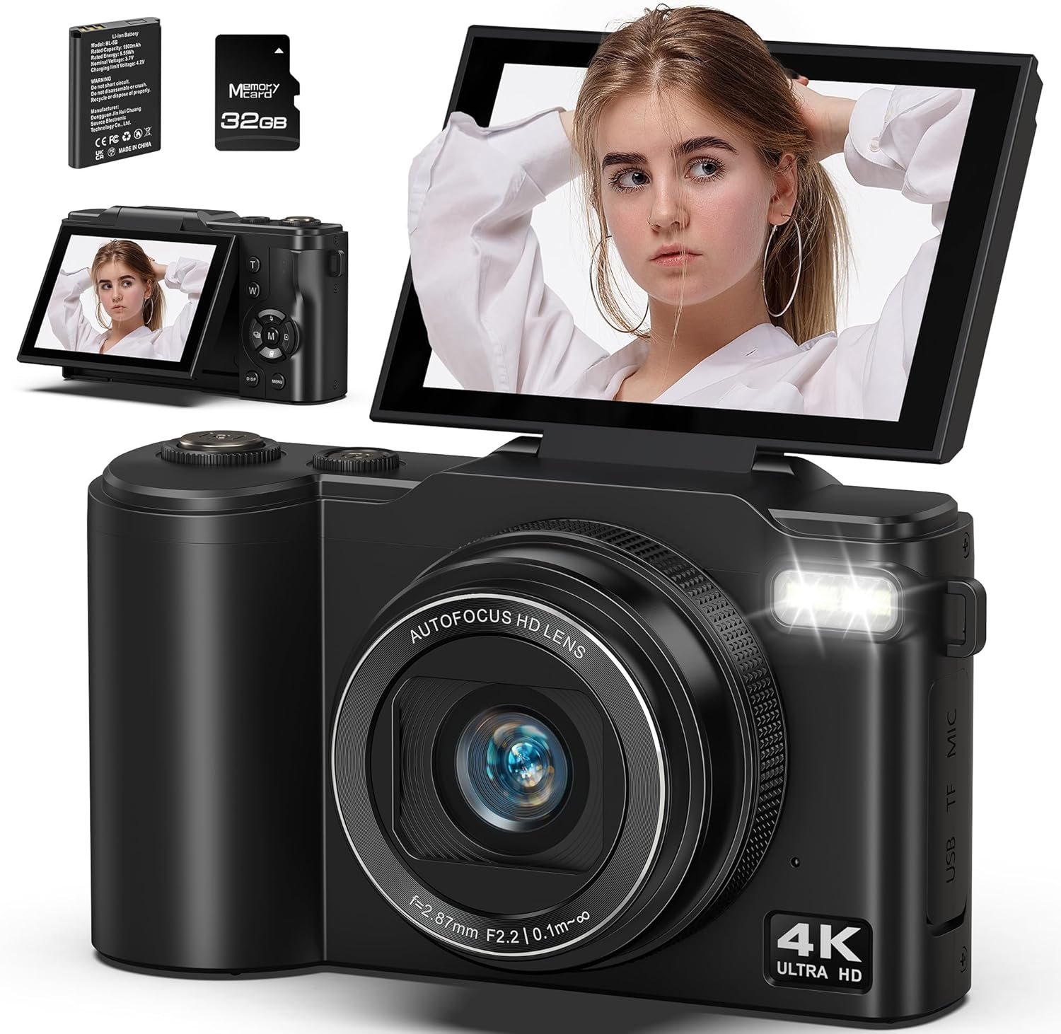 4K Digital Camera for Photography, 64MP Vlogging Camera for YouTube with 180° Flip Screen, 18X Zoom UHD Autofocus Video Camara, Compact with 32GB Micro SD Card for Kids, Teens, Boys & Girls, Beginners
