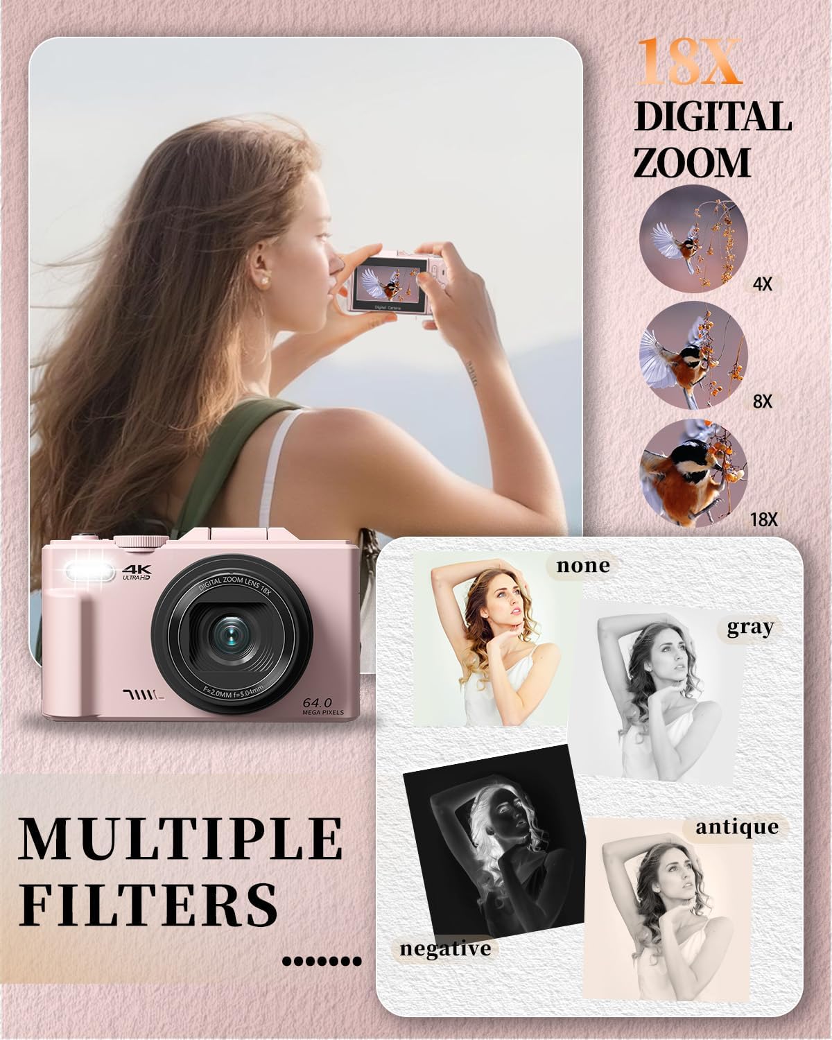 【Powerful 18X Digital Zoom & 7 Filter Effects】 Equipped with a 18X Digital zoom, this camera allows you to shoot both close-ups and distant subjects with clear, distortion-free images. Its versatility makes it perfect for travel photography and portrait photography. Additionally, it comes with 7 built-in filter effects, so can easily enhance their photos with black and white, vintage, or artistic styles, offering a fun way to experiment with different looks without complicated editing.