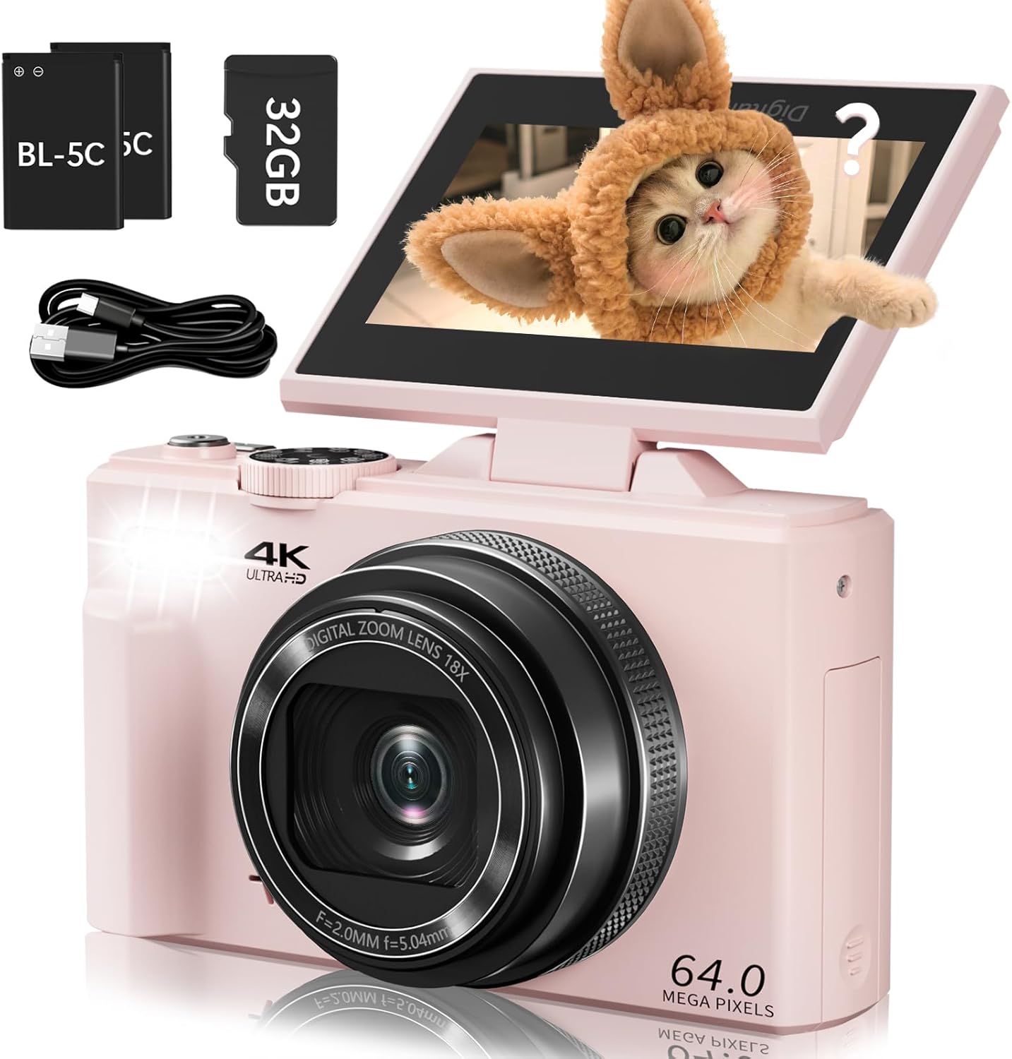 4K Digital Camera for Photography and Vlogging, YouTube Camera with 3″ 180° Flip Screen, Autofocus, WiFi, 18X Zoom, Flash, 2 Batteries & 32GB SD Card