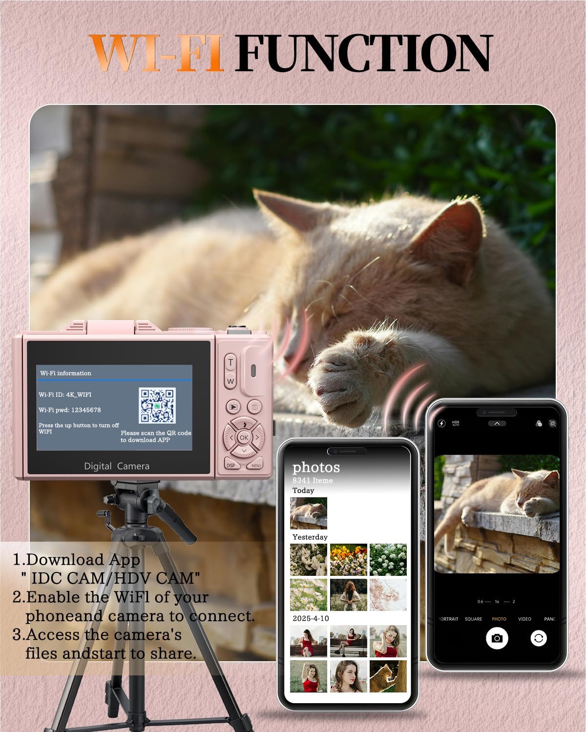 【4K Video & 180° Flip screen】 The Video camera supports 4K video recording, providing smooth, hight-quality video with autofocus to keep your shots clear. The 3-inch 180° flip screen simplifies shooting, especially for selfies and vlogs, with easy-to-understand menu controls. You can quickly adjust settings different modes and shooting angles, making it ideal for travel photography and casual everyday use