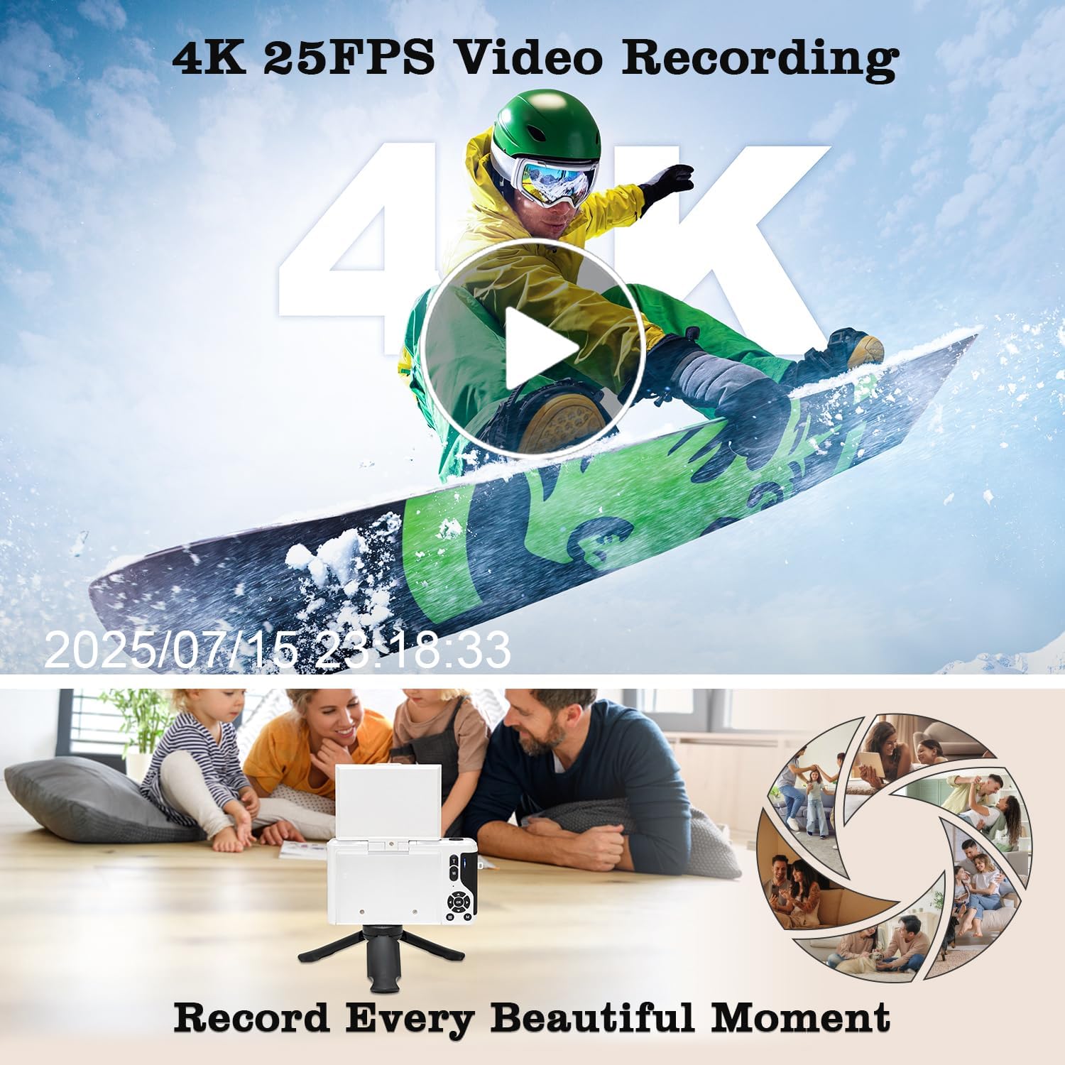 【Multifunctional Point-and-Shoot Camera】This camera digital 4k is loaded with all the features for photos and videos. It has four photo modes (Burst shooting, Timed shooting, Auto photo, and Normal) and four video modes (Time-lapse, Loop recording, Slow-motion, and Normal), plus a bunch of fun filters to play with. It also comes with useful features like a date stamp, exposure compensation (-3.0 to +3.0), and video pause. wonderful for the beginners who want to get creative with their content!