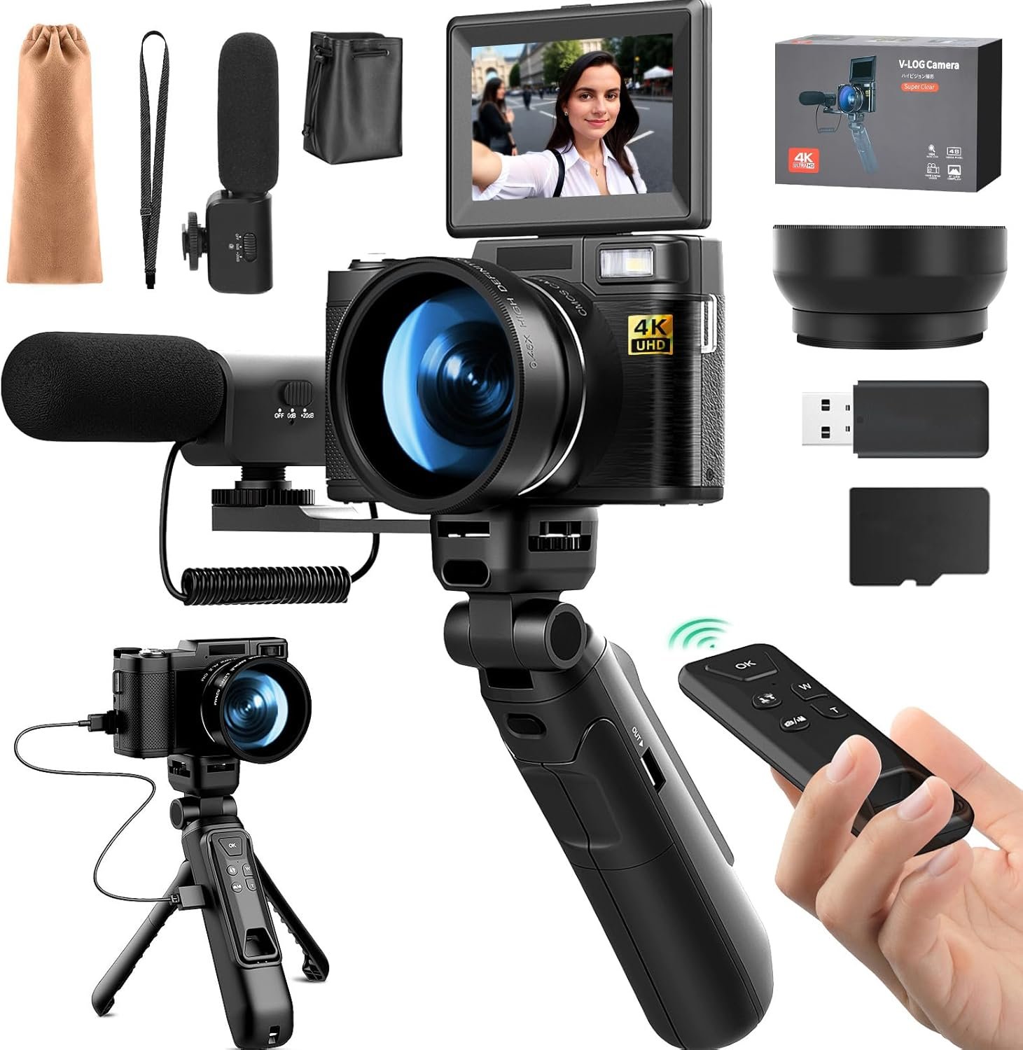 4k Digital Cameras for Photography, 48MP Video/Vlogging Camera for YouTube, Vlogger Kit, Content Creator Kit-Microphone & Remote Control Tripod Grip, Travel Camera with Wide-Angle & Macro len