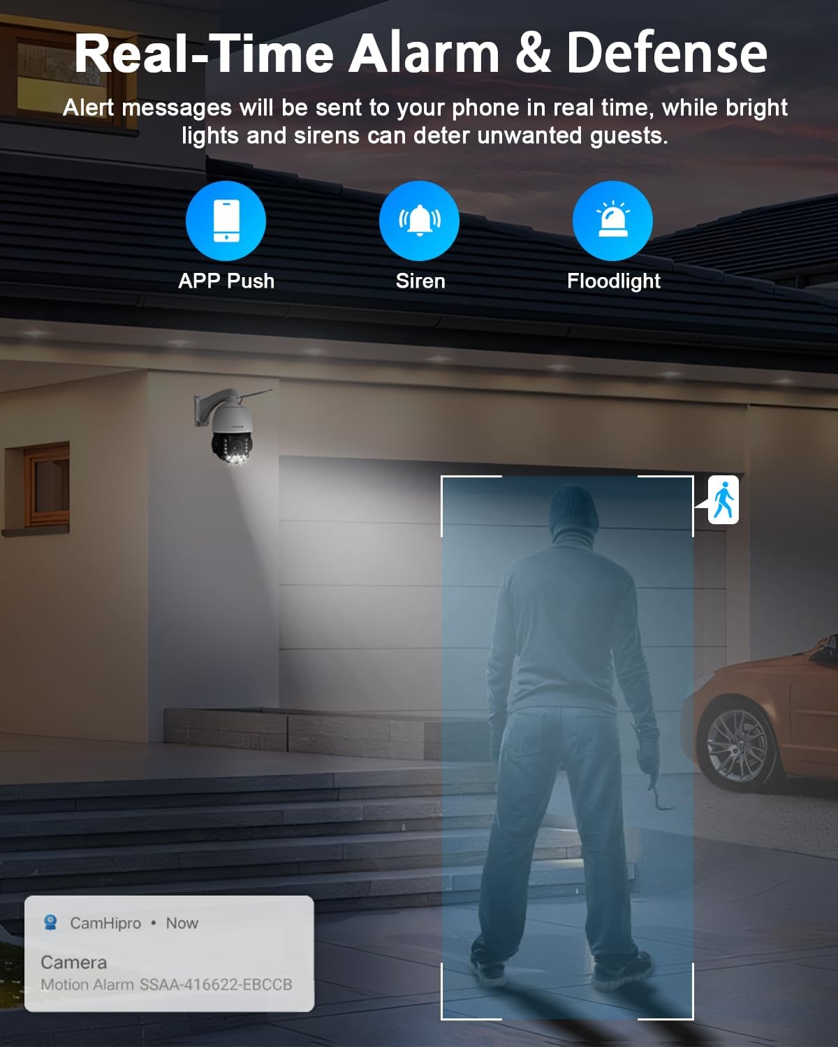 Smart Person/Vehicle Detection & Real-Time Alarm: This PTZ wifi camera can intelligently identify people and vehicles and send you real-time and accurate alerts. No need to worry about animals, insects, fallen leaves, etc. triggering alarms, allowing you to focus on the real threats. You can also customize detection areas, sensitivities and schedules, greatly reducing false alarms.