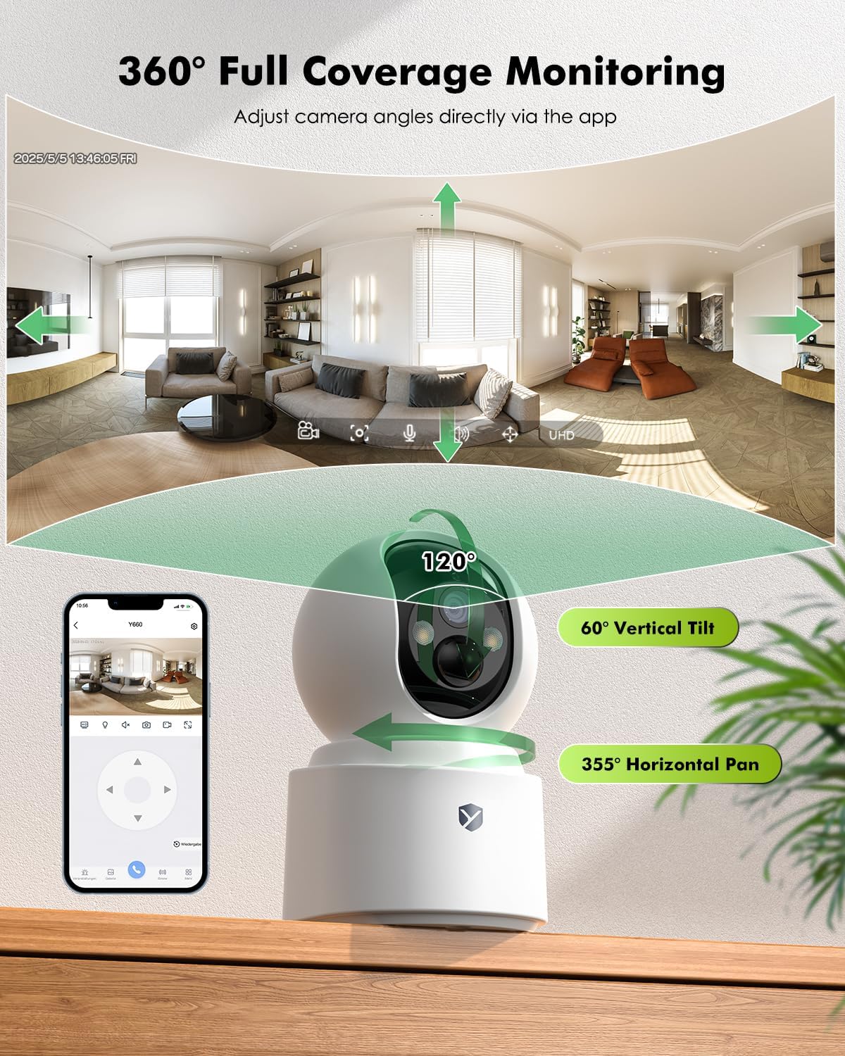 【360° Panoramic Coverage & Dual-Band WiFi】 The battery security camera rotates 355° pan and 60° tilt, eliminating blind spots entirely. Its 10x zoom lets you see critical details, delivering comprehensive home security/pet or kids monitor in one step. Dual-band 2.4G/5G WiFi ensures ultra-stable connectivity, with smooth, lag-free live streaming and video playback.