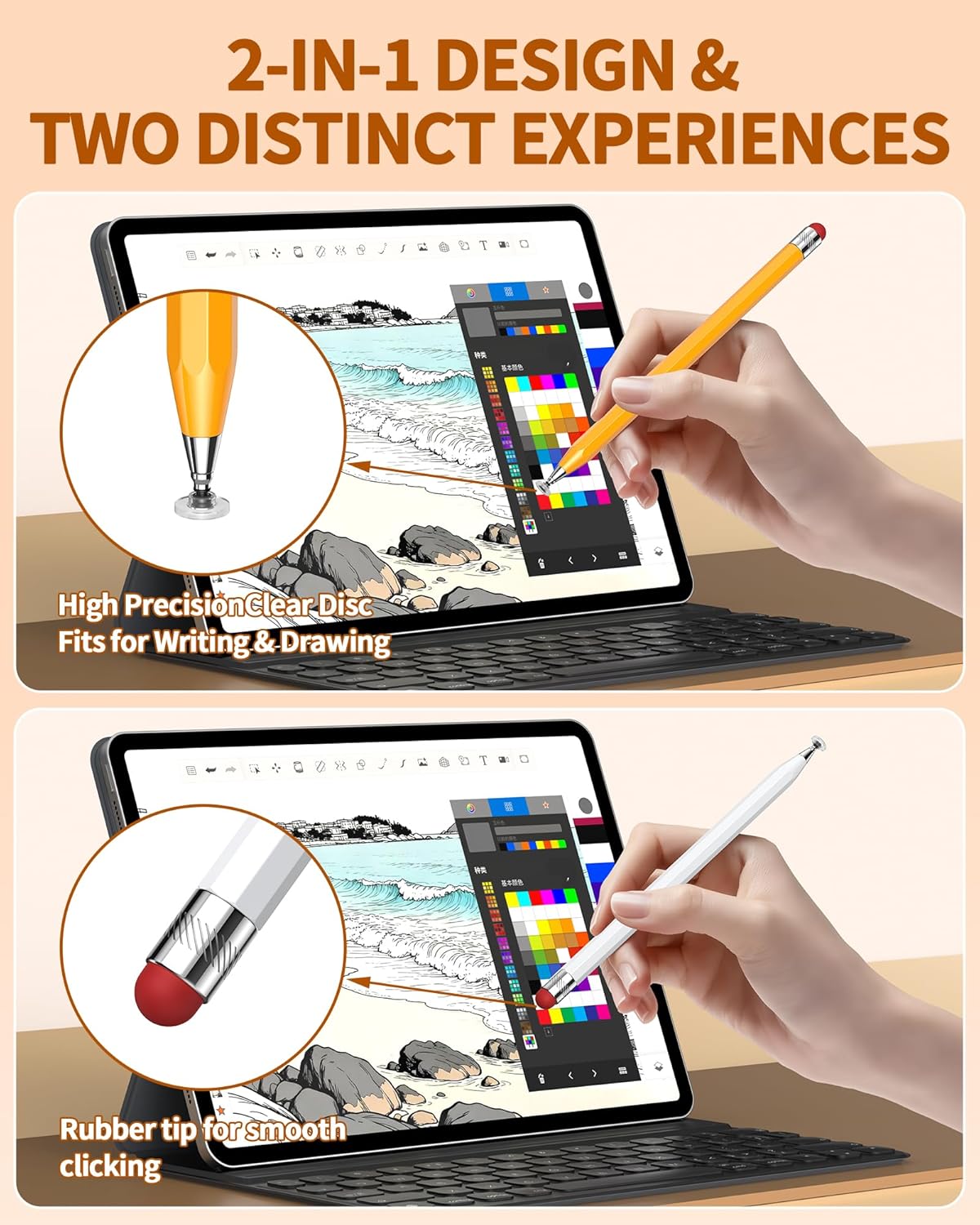 【2-in-1 Stylus Pen for Touchscreen】 One end features a precise 0.27-inch transparent disc tip for accurate writing and drawing, allowing you to clearly see where you’re marking. The other end boasts a sensitive 0.27-inch rubber tip ideal for effortless scrolling and navigation. High sensitivity and smooth responsiveness deliver an authentic writing experience like on paper, While preventing fingerprints and scratches on the screen.