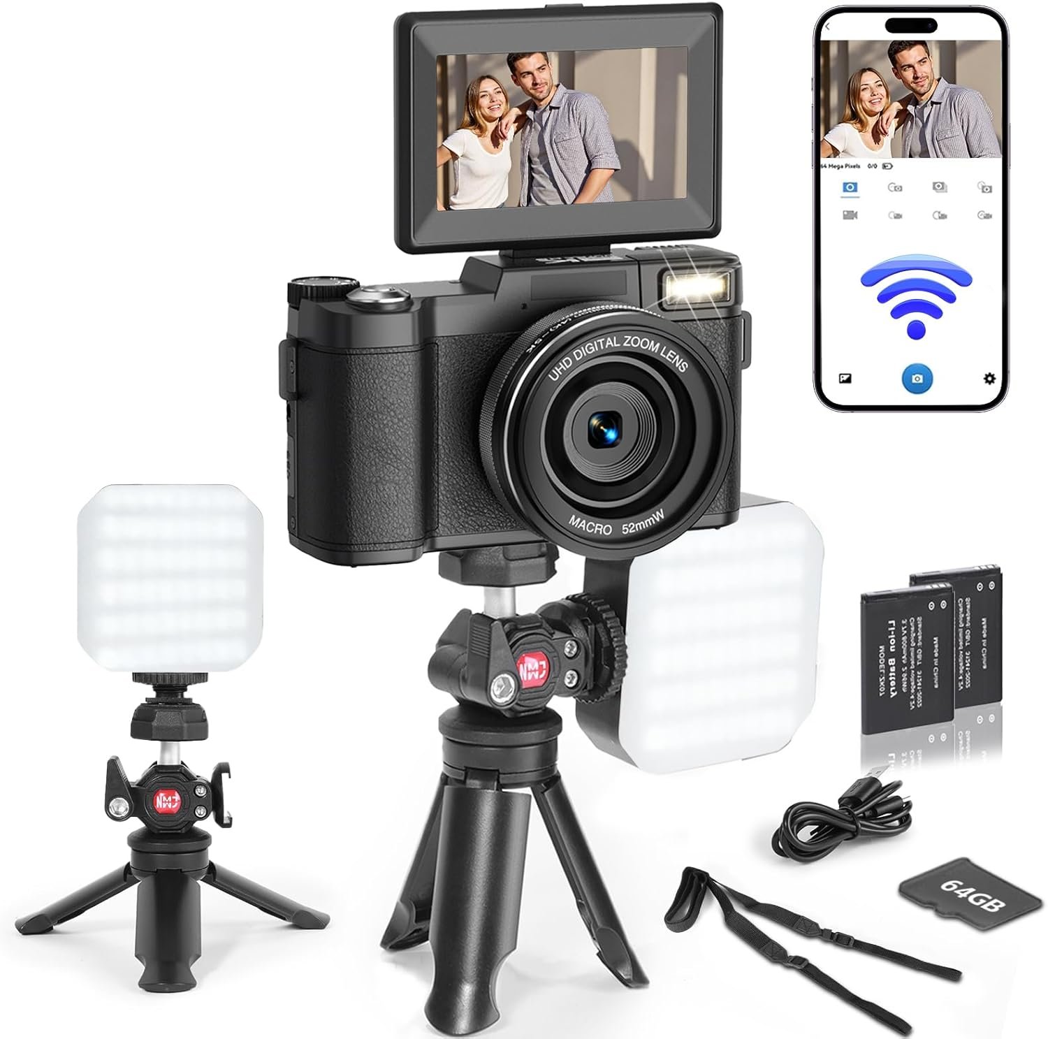 5K Digital Camera with WiFi for Photography, 64MP Vlogging Camera with Flip Screen for YouTube, Includes 64GB SD Card, Tripod, Selfie Light & 2 Batteries