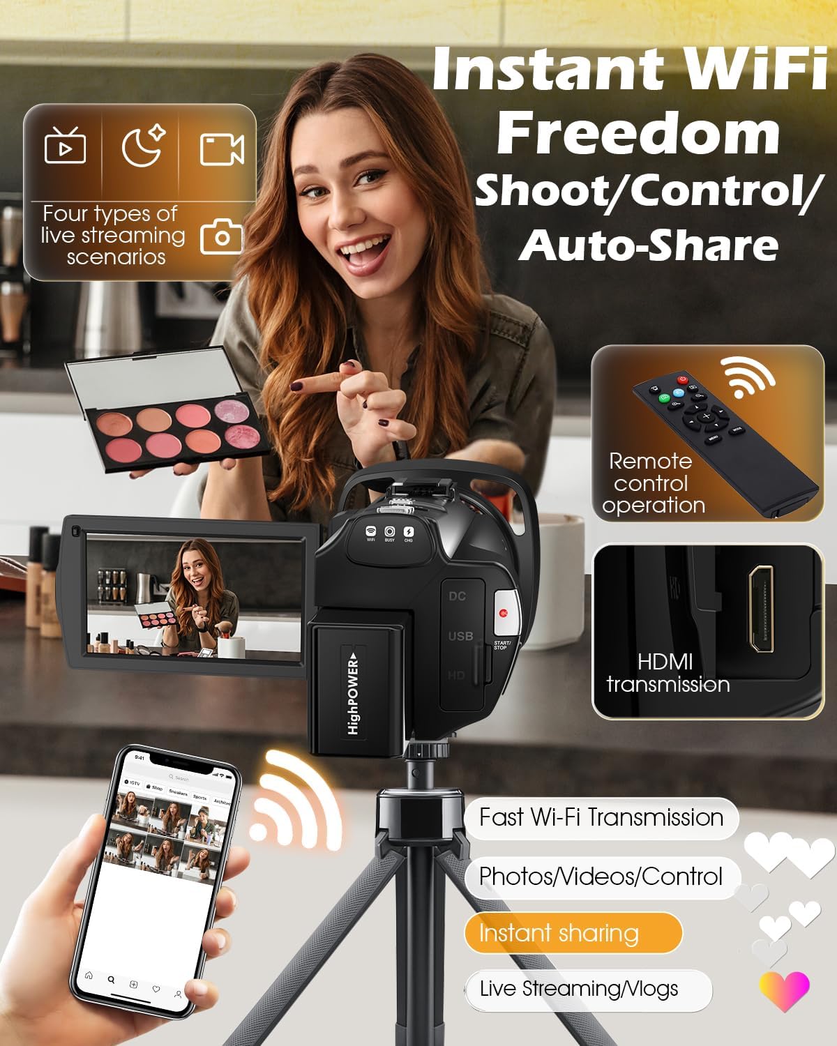 【WiFi Connectivity & Live Streaming Ready】 Designed for modern creators, this camcorder supports WiFi wireless connection for easy sharing, remote control, and live streaming. Use it for video recording, photography, online streaming, or video calls—ideal for creators, beginners, and anyone who wants a powerful camera that fits naturally into everyday life.