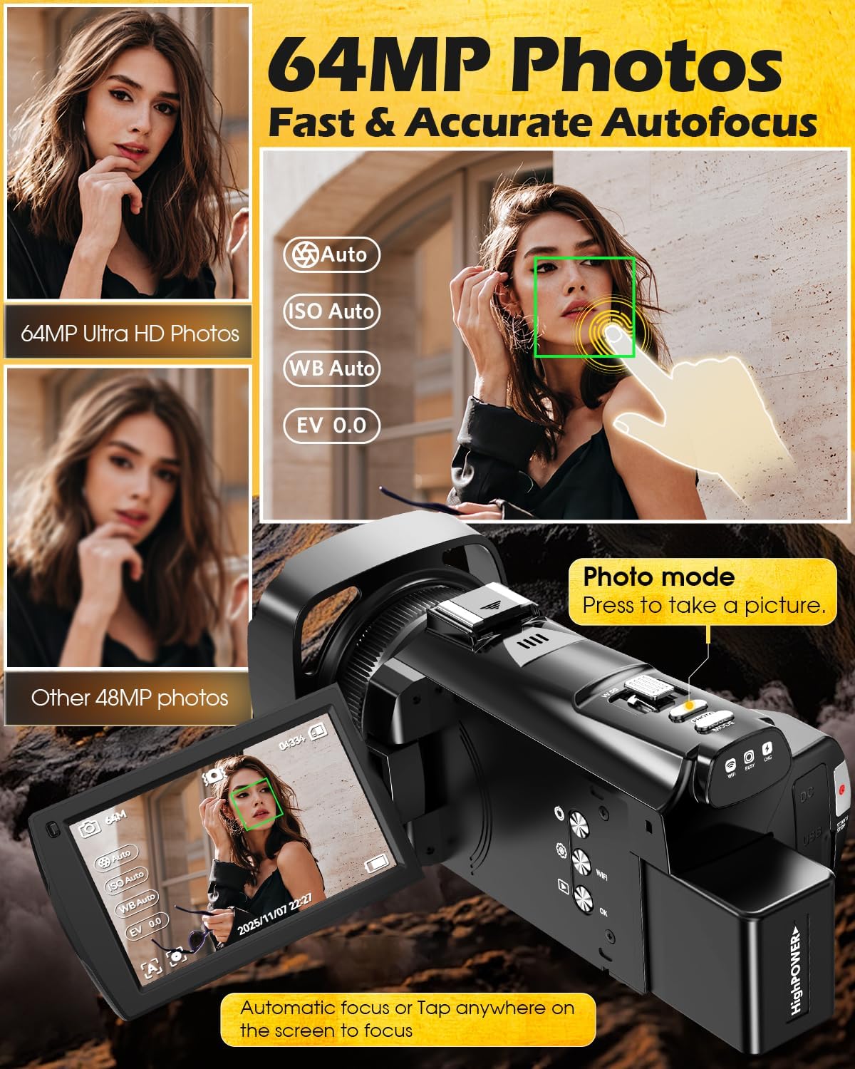 【All-in-One 5K Live Streaming & Recording Camera】 Designed for both live streaming and daily recording, this video camera delivers stunning 5K/25FPS video and ultra-clear 64MP photos. Whether you’re live streaming, filming tutorials, recording vlogs, or capturing everyday moments, one device handles it all—simple to use, yet powerful enough for serious creators.