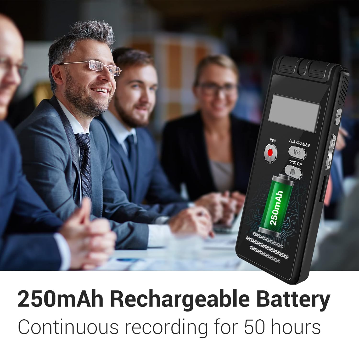 —Built-in 250mAh rechargeable lithium battery, continuous recording for 40 hours, and earphone play for about 25 hours.Low power shutdown save function.