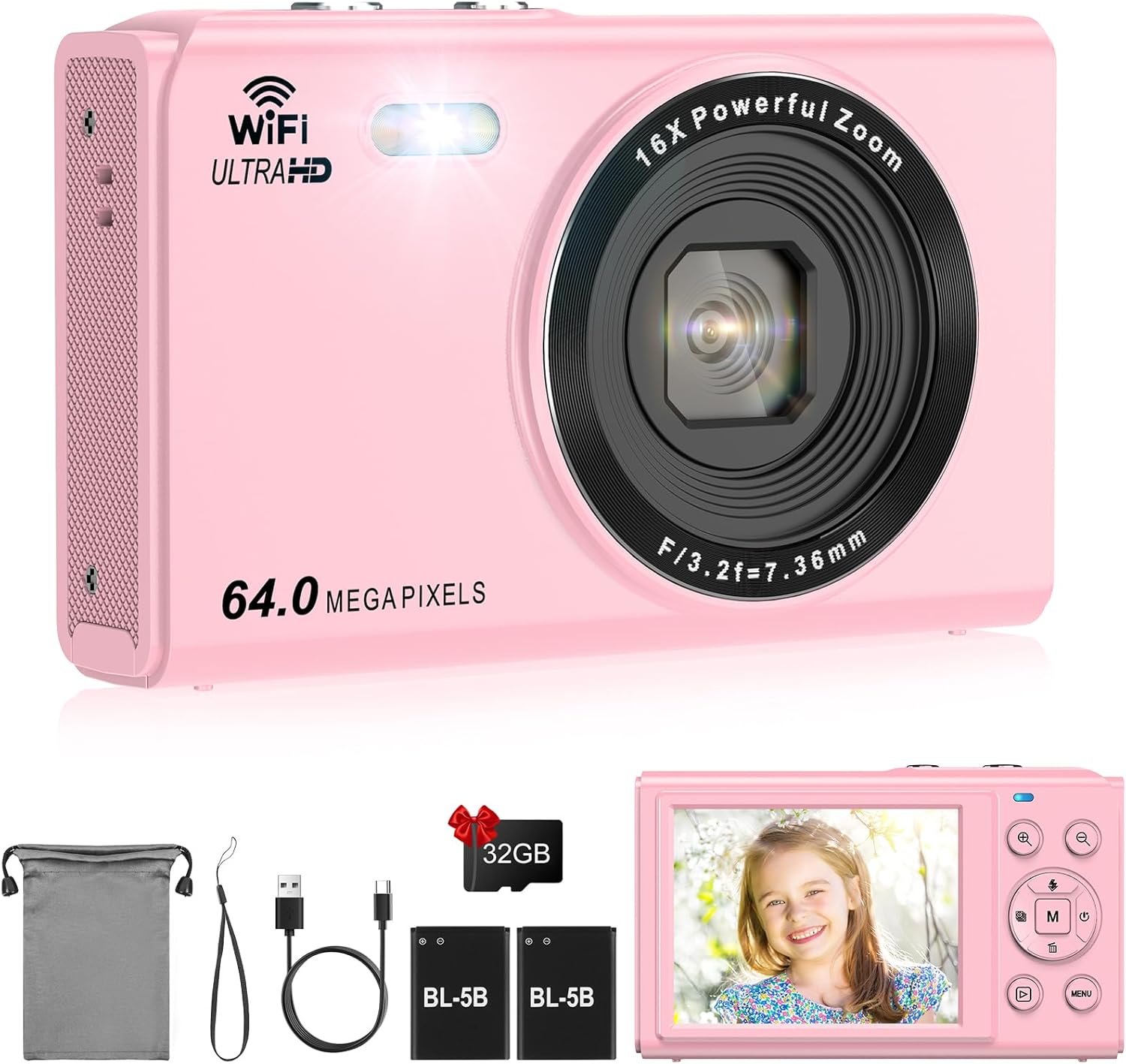 64MP Digital Camera, 16X Zoom, FHD 1080P Point and Shoot Digital Camera, Anti-Shake Compact Small Camera with 32GB Card&Fill Light, Two Batteries, 2.8″ LCD Screen Camera for Kids Student Teenager, PK