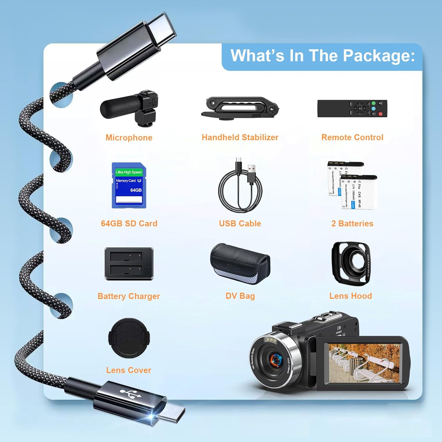 8K & 64MP Video Camera: The 8K camcorder, with advanced 8K resolution and 64 MP capability, excels in video and image processing. It features a 3″ /270-degree rotating IPS screen and 18x digital zoom. The video recorder camcorder comes with a 64GB high-speed memory card specifically designed for cameras, with support for expansion up to 256GB. This vlog camera is the perfect companion for exploring this beautiful world! Great for traveling, meetings, studying, and capturing lovely moments.