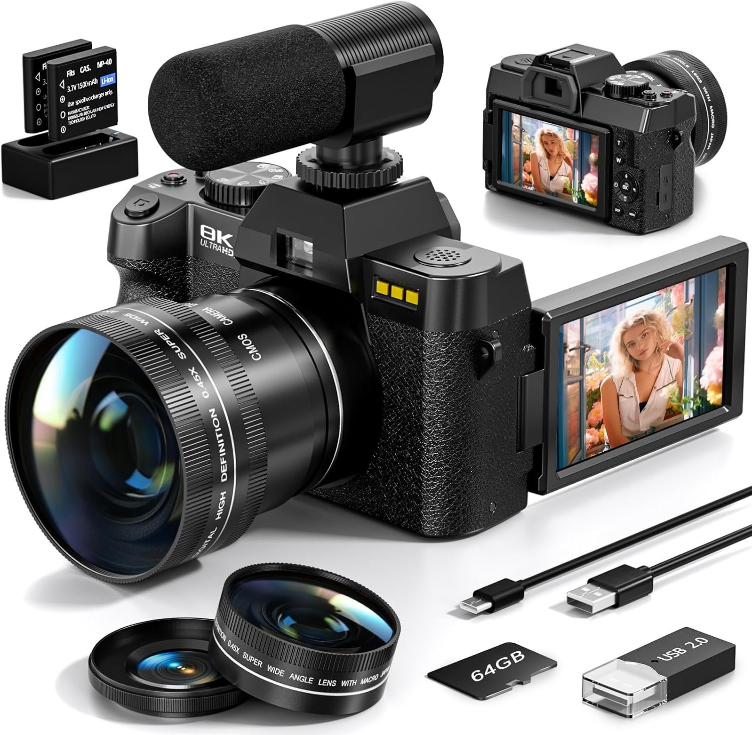 8K Digital Cameras for Photography, 64MP vlogging Camera with 180°Flip Screen,2 Batteries, 64GB TF Card,16X Zoom, WiFi,Microphone, Wide & Macro Lens Kit (Black)