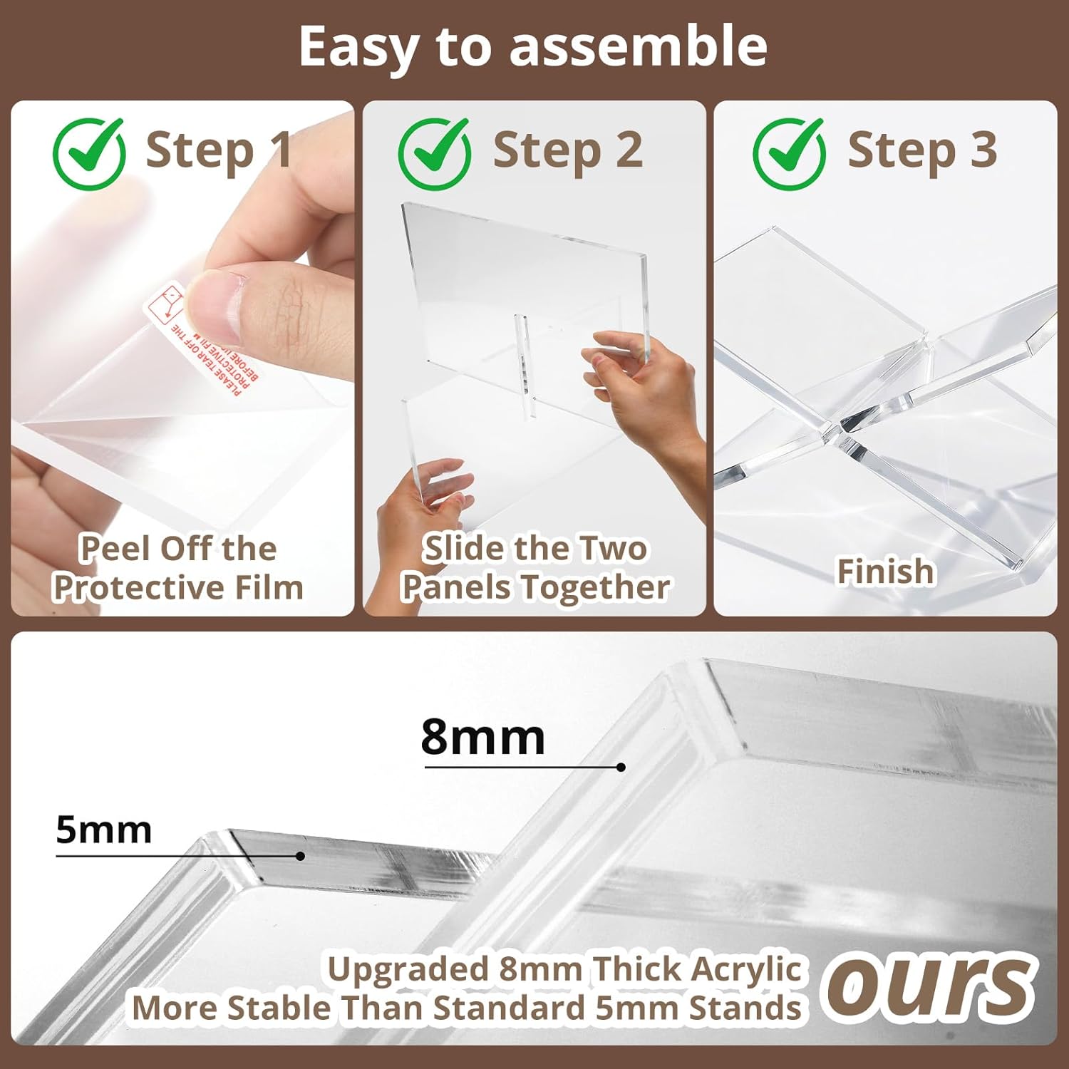 Simple 2-Piece Cross Design: No tools, no screws. The two acrylic panels slide together to form a strong, stylish book holder stand that assembles in seconds and stores flat when not in use.