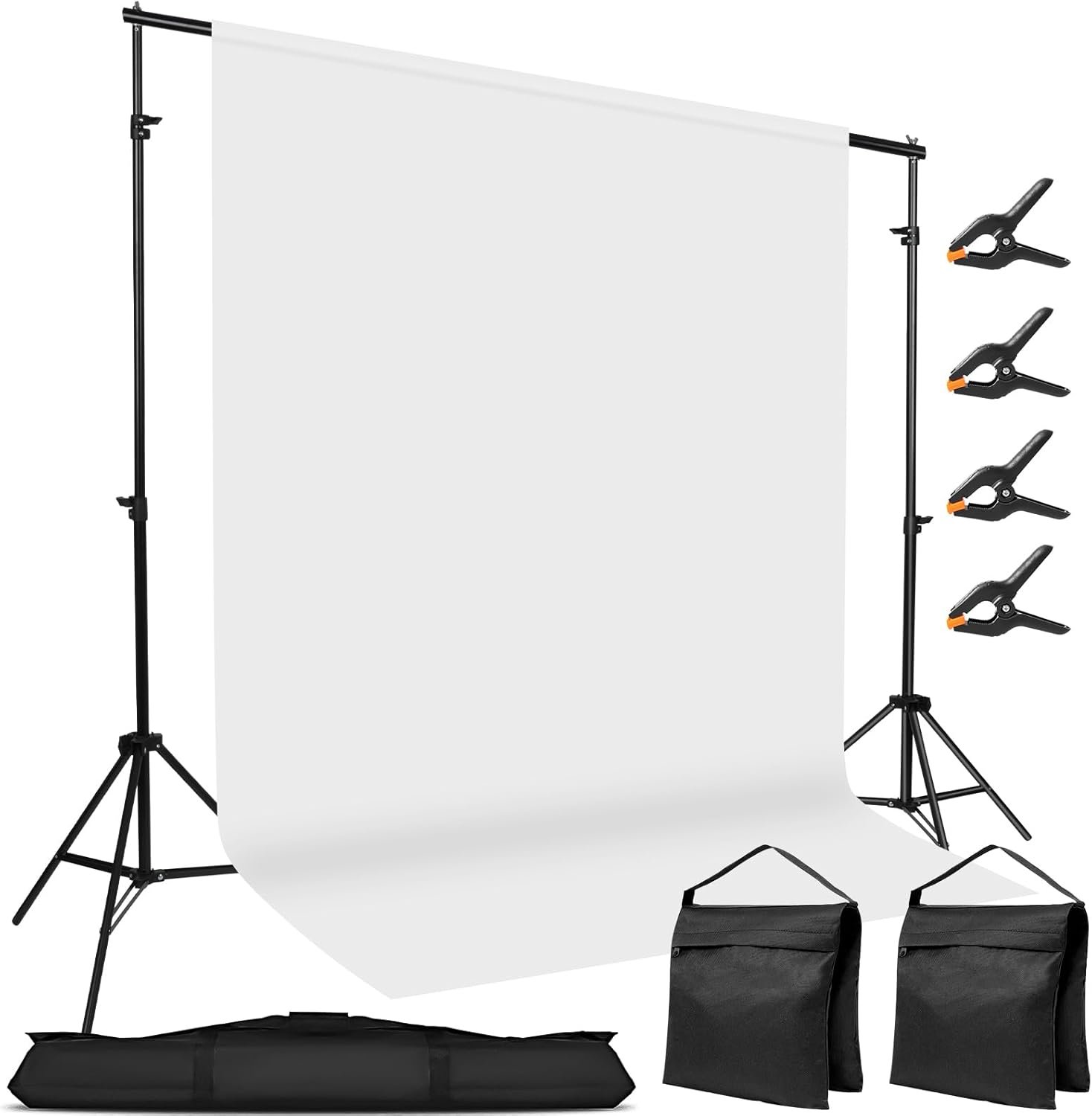 Adjustable Photography Backdrop Stand Kit 10x7ft(WxH) – Photo Studio Background Support with 4 Crossbars, 4 Clamps, 2 Sandbags, (with 10 * 7 Feet White Backdrop Curtain)