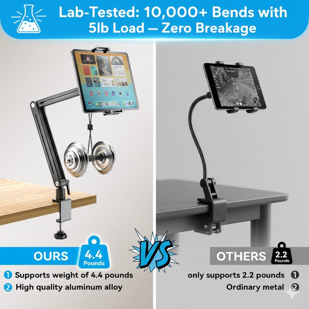This tablet mount is made from high-quality aluminum alloy, making it lighter yet sturdier—easily supporting up to 4.4 pounds.