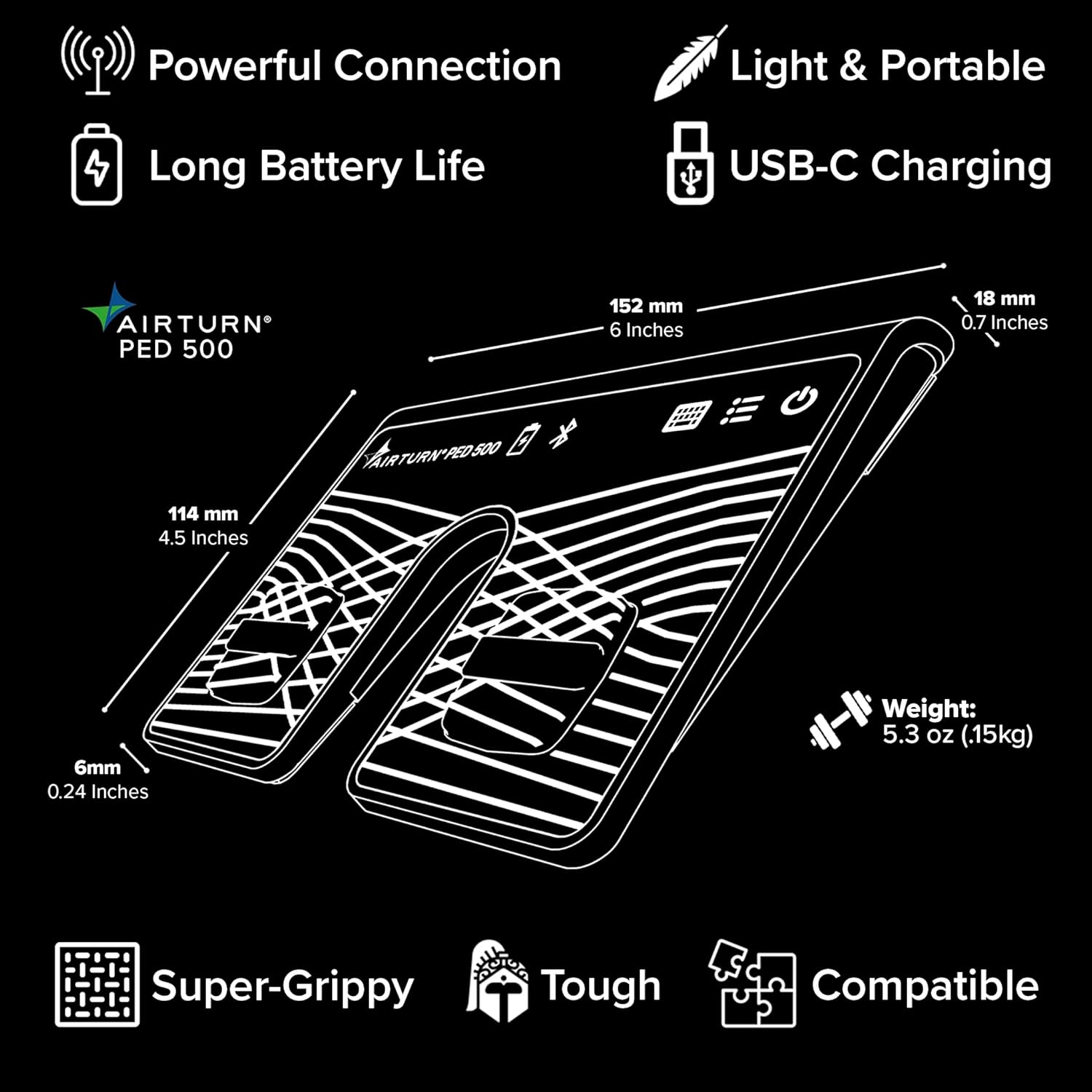 Slim, Tactile, and Stage-Ready – The AirTurn PED 500 delivers effortless control in a low-profile design built for performers. Quiet-tactile switches with wide target zones respond smoothly on any surface, from carpet to hardwood, while the slim frame makes it comfortable for both seated and standing use. Compact, lightweight, and rugged, it’s the perfect travel companion for musicians on the go.