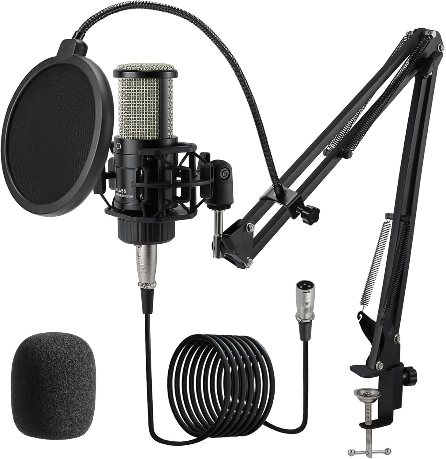 Package List:Alabs singing microphone kit includes:1 x condenser microphone,1 x shock mount, 1 x 2m XLR cable, 1 x foam cap,1 x Boom arm, 1 x pop filter, 1 x windscreen, 1 x user manual