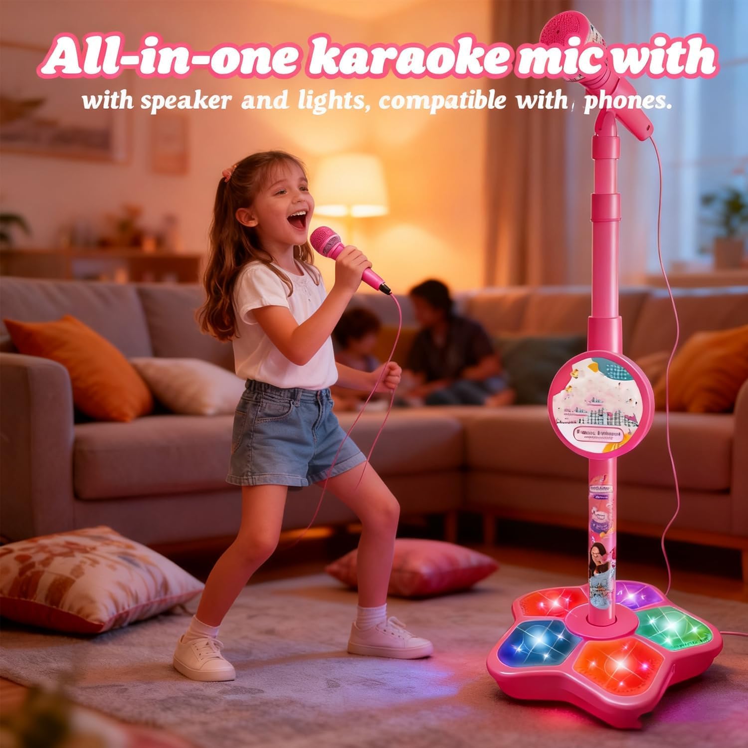 All-in-One Microphone Toy, Upgraded Kids Karaoke Machine with Adjustable Stand, Colorful Lights, and Echo Effect, with Mobile Phones, for Christmas and Birthday (Black)