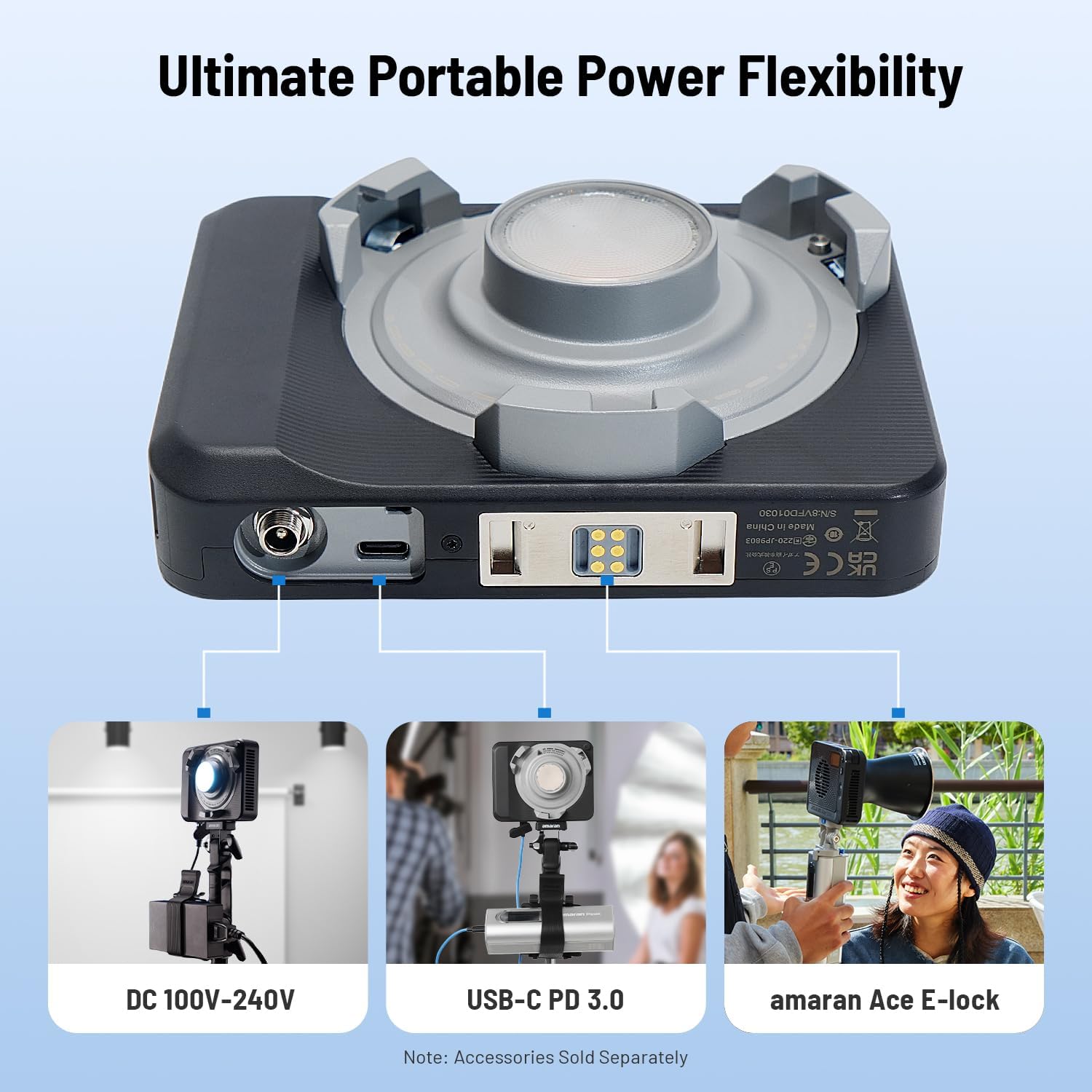 Ultimate portable power flexibility: In addition to the included DC power adapter, the amaran Ray 60c is built for mobility with amaran Ace E-Lock and USB-C PD support. Run for 46 minutes at 100% output with the amaran Peak 75 via Ace E-Lock for a cable-free setup or 1 hour via the USB-C port. Or power with USB-C PD power banks and chargers – eliminating NP-F or V-Mount batteries while keeping your setup streamlined from outdoor to studio shoots