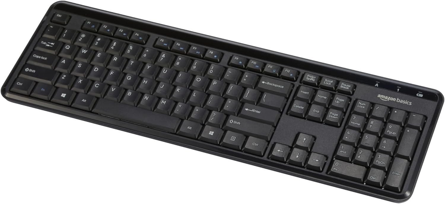 Amazon Basics Wireless Keyboard-Quiet and Compact-US Layout (QWERTY) QUIET TYPING EXPERIENCE: Work comfortably with a quiet keyboard, featuring sound-dampened keys COMPLETE FUNCTIONALITY:…
